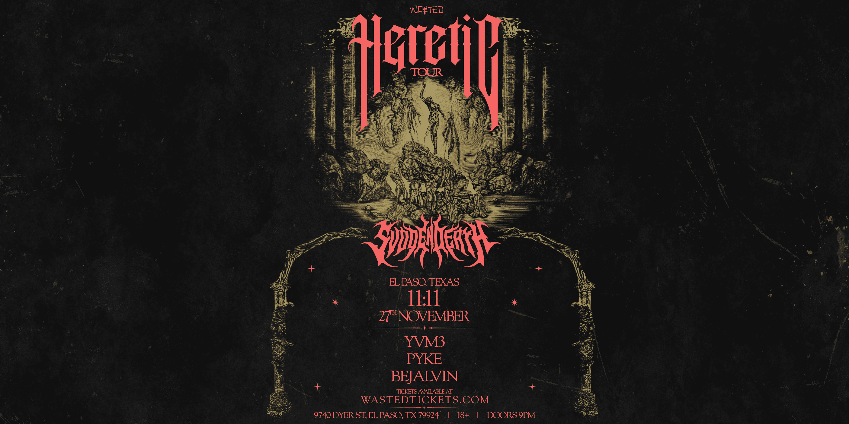 The Heretic Tour featuring SVDEEN DEATH w/ support by YVM3, PYKE & BEJAVIN arrives at 11:11 El Paso on Wednesday, November 27th, 2024!