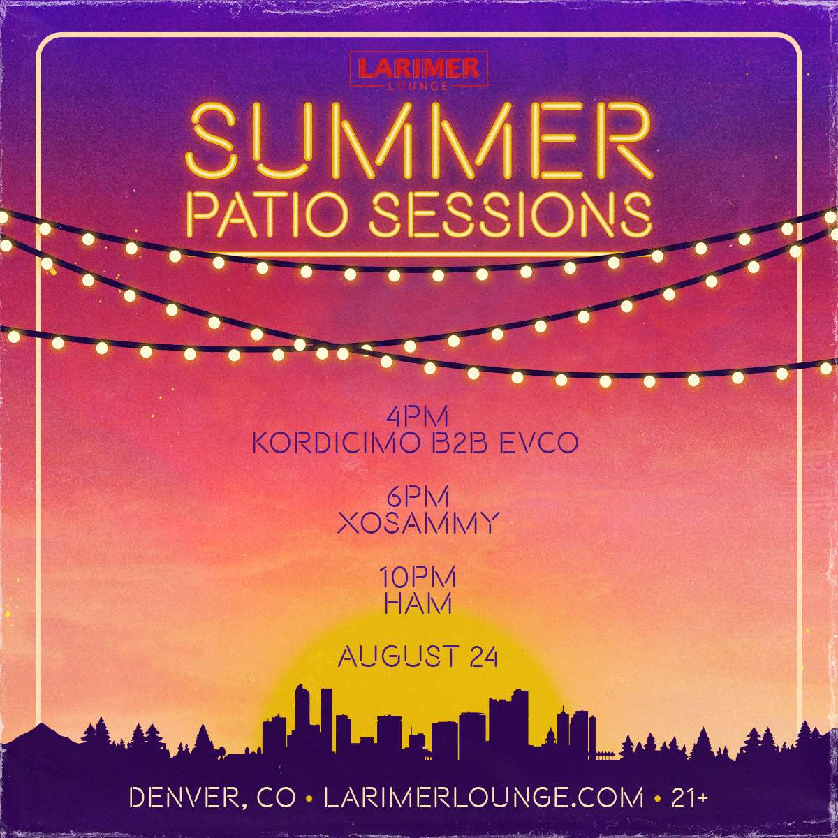 Larimer Lounge Presents Summer Sessions on Saturday, August 24th (FREE EVENTS). 4PM - Kordicimo b2b Evco 6PM - XOsammy 10PM - Ham 21+