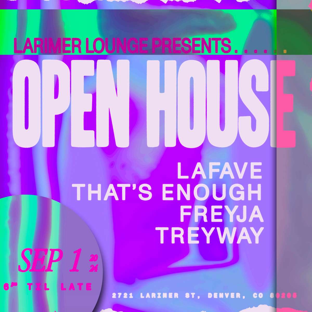Larimer Lounge presents Open House Featuring LaFave, That's Enough, FREYJA and Treyway (FREE EVENT) on Sunday, September 1st.