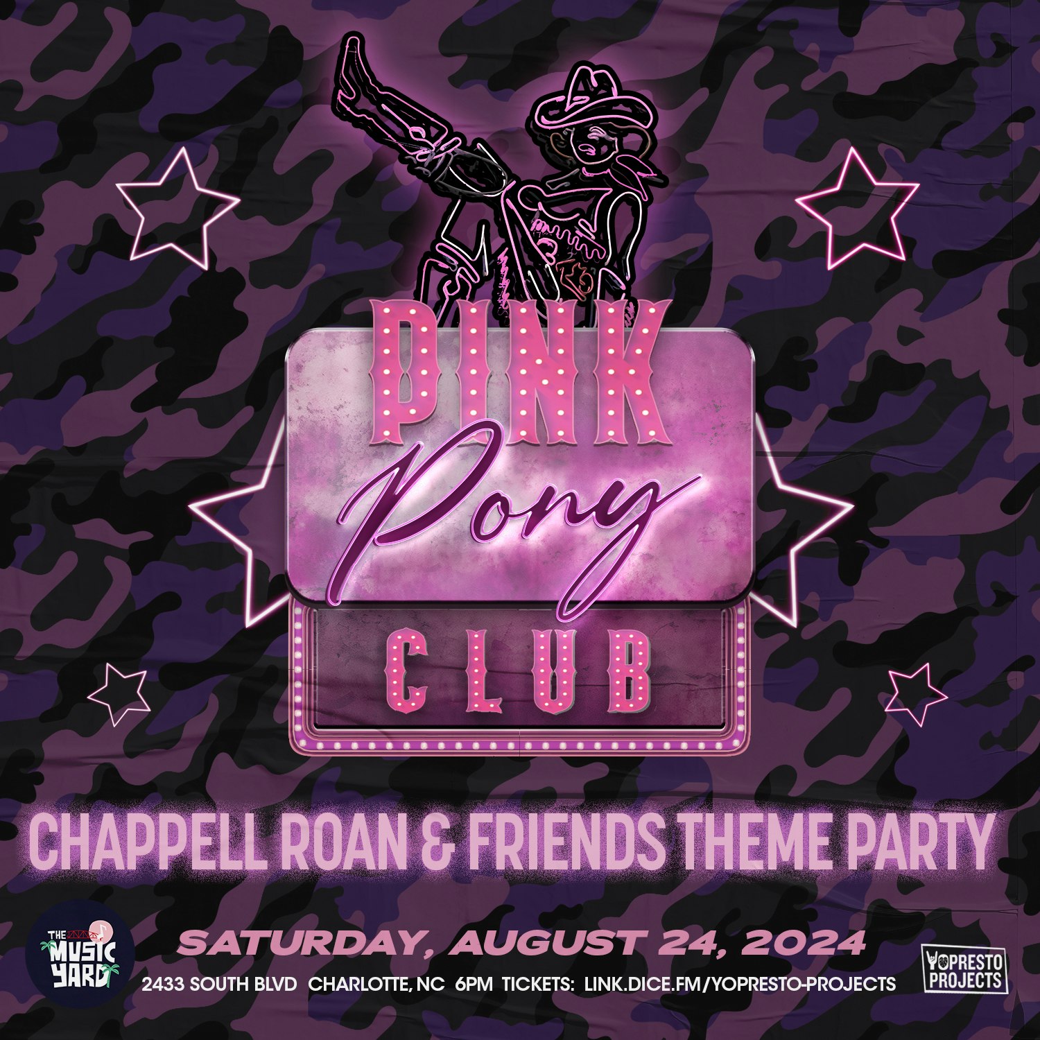 Announcing Pink Pony Club “Chappell Roan & Friends Theme Party” happening Saturday, August 24th at The Music Yard! Join us for a night of Chappell Roan mixed with your favorite girly pop bops!
