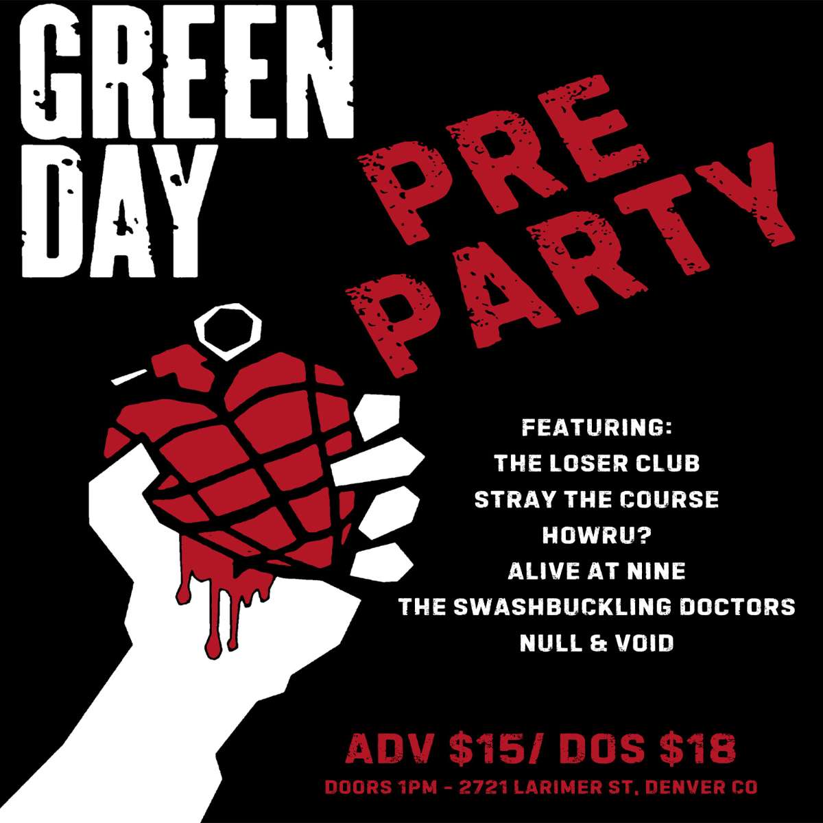Larimer Lounge Presents Green Day Pre Party with The Losers Club, Stray The Course, HOWRU?, Alive At Nine, The Swashbuckling Doctors and Null & Void on Saturday, September 7th. - All ages, ticketed guests under 16 admitted with ticketed guardian