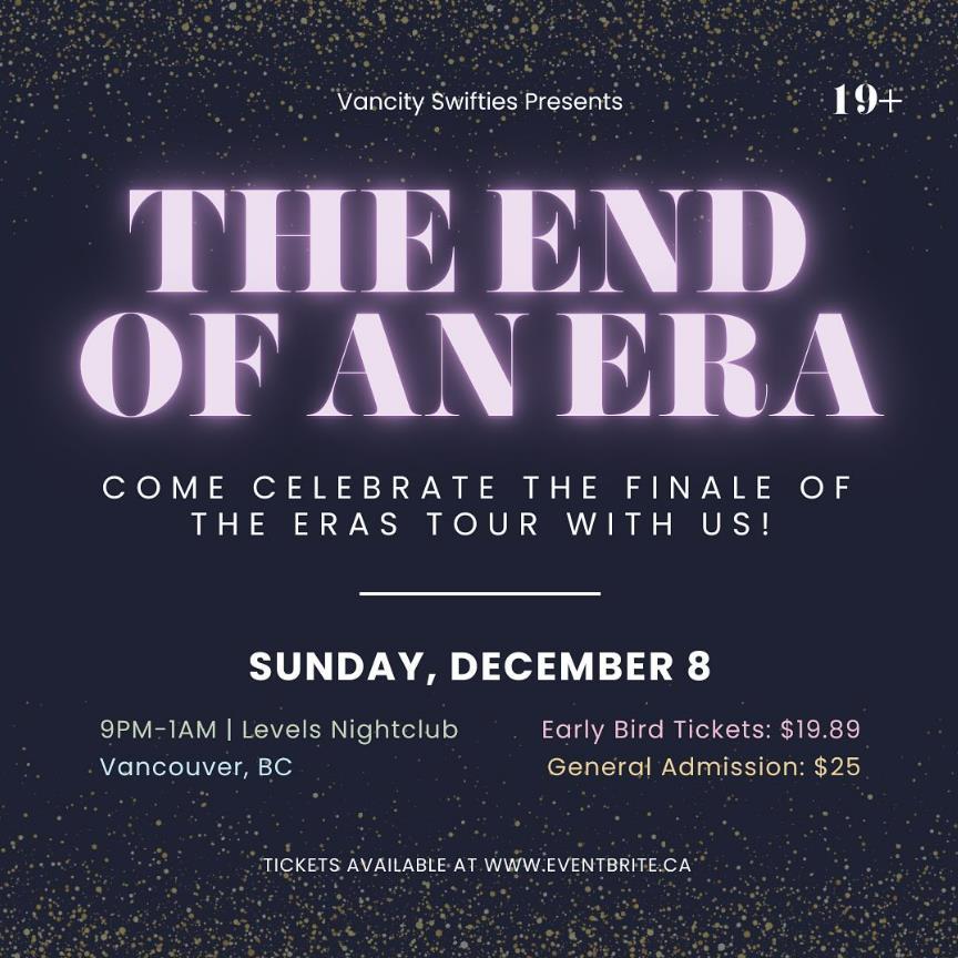 Ticket link: We are soooo excited to be hosting another event for the ✨ Vancouver Swifties ✨ and host one more night to sing and dance together, and end off the Eras Tour with a BANG!