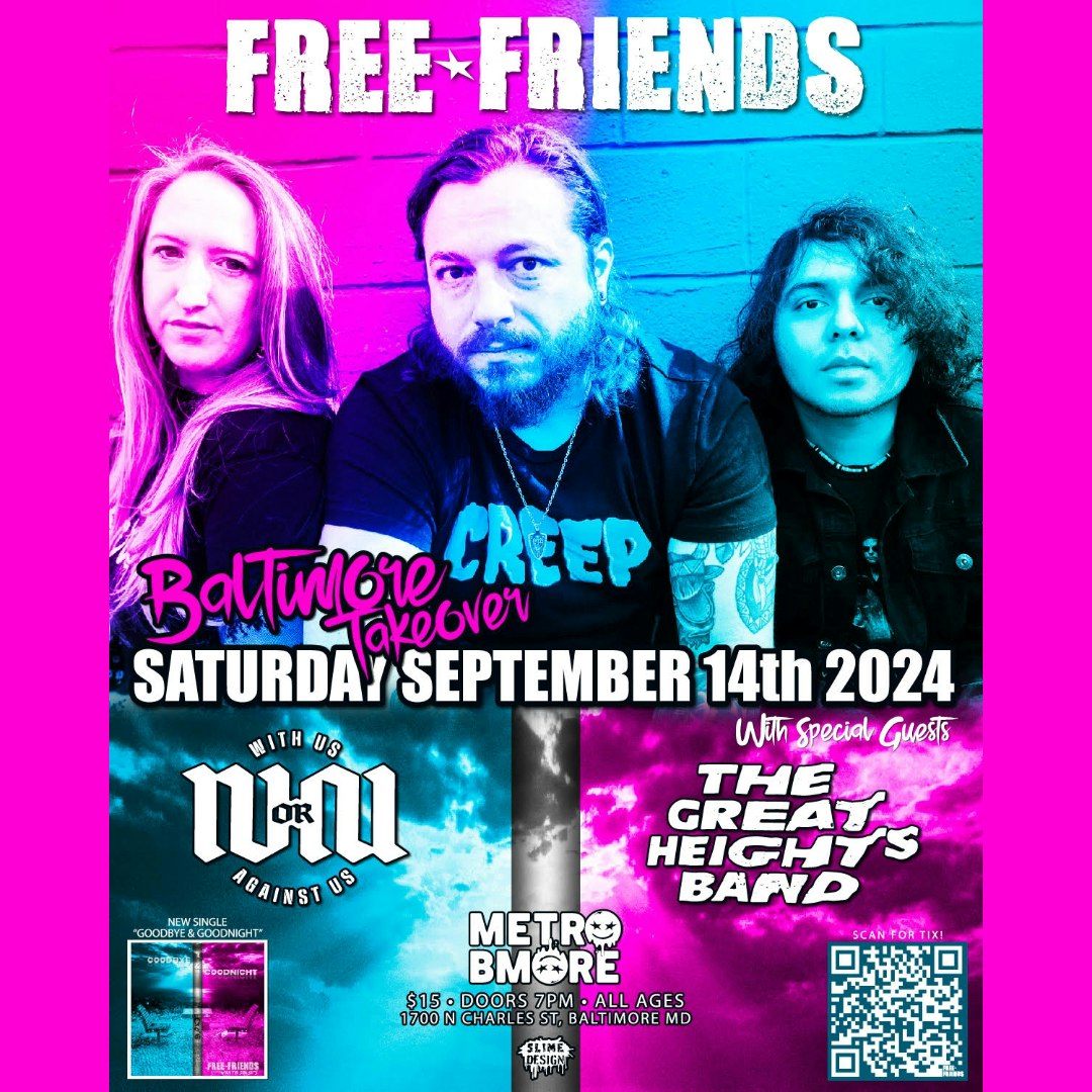 FREE FRIENDS w/ The Great Heights Band and With Us Or Against Us Saturday September 14, 2024 Doors at 7:00 PM, Show at 8:00 PM All Ages Presented by Metro Gallery LLC. All Ages