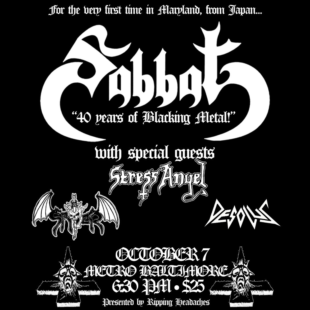 SABBAT (JAPAN) with Stress Angel, Spiter and Desolus Monday October 7th 2024 Doors 6:30 // Show 7:30 All Ages Presented by Ripping Headaches All Ages
