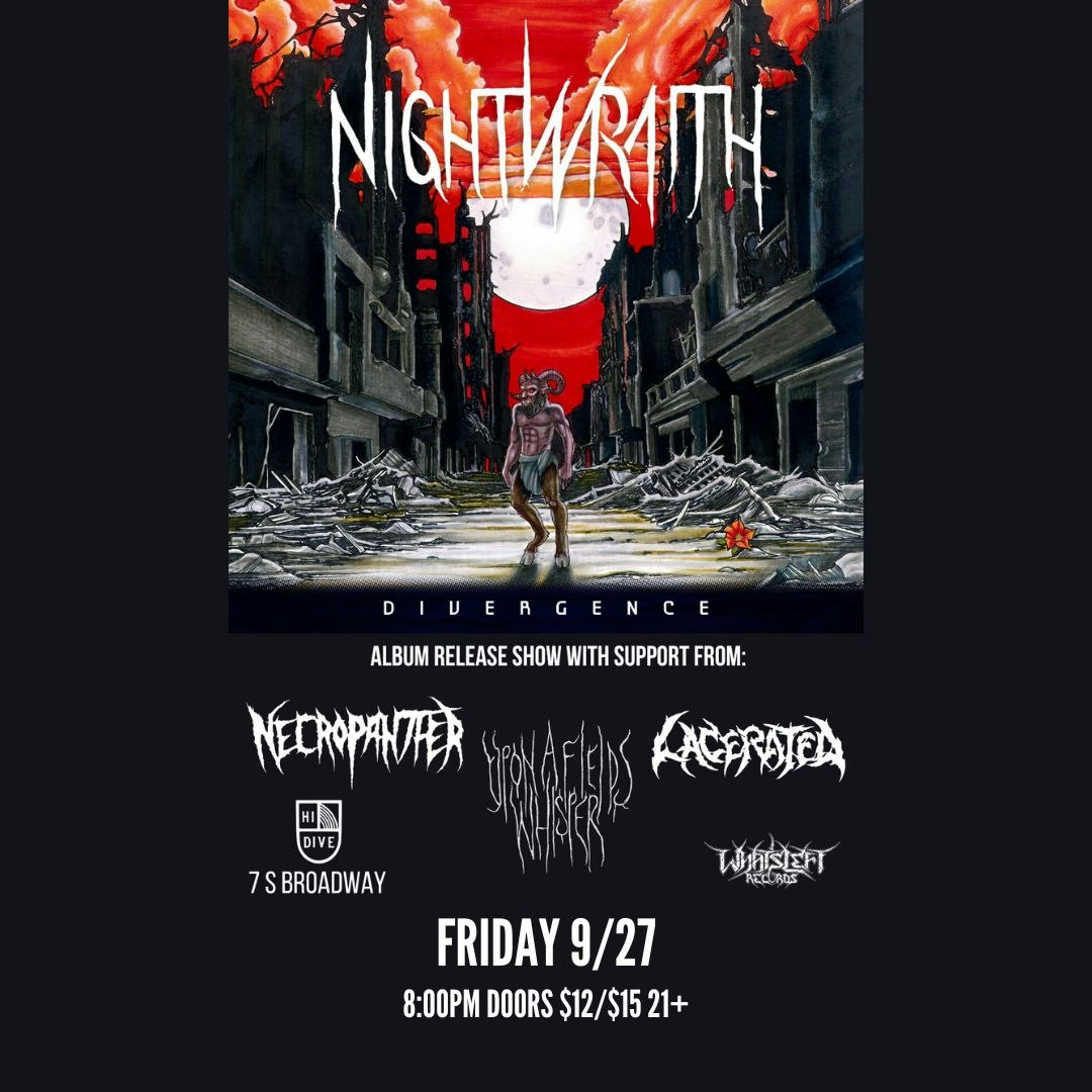 NIGHTWRAITH (Album Release Show) with NECROPANTHER, UPON A FIELDS WHISPER + LACERATED (Doors 7pm/Show 8pm- 21+) Presented by Hi-Dive. This is an 21+ event
