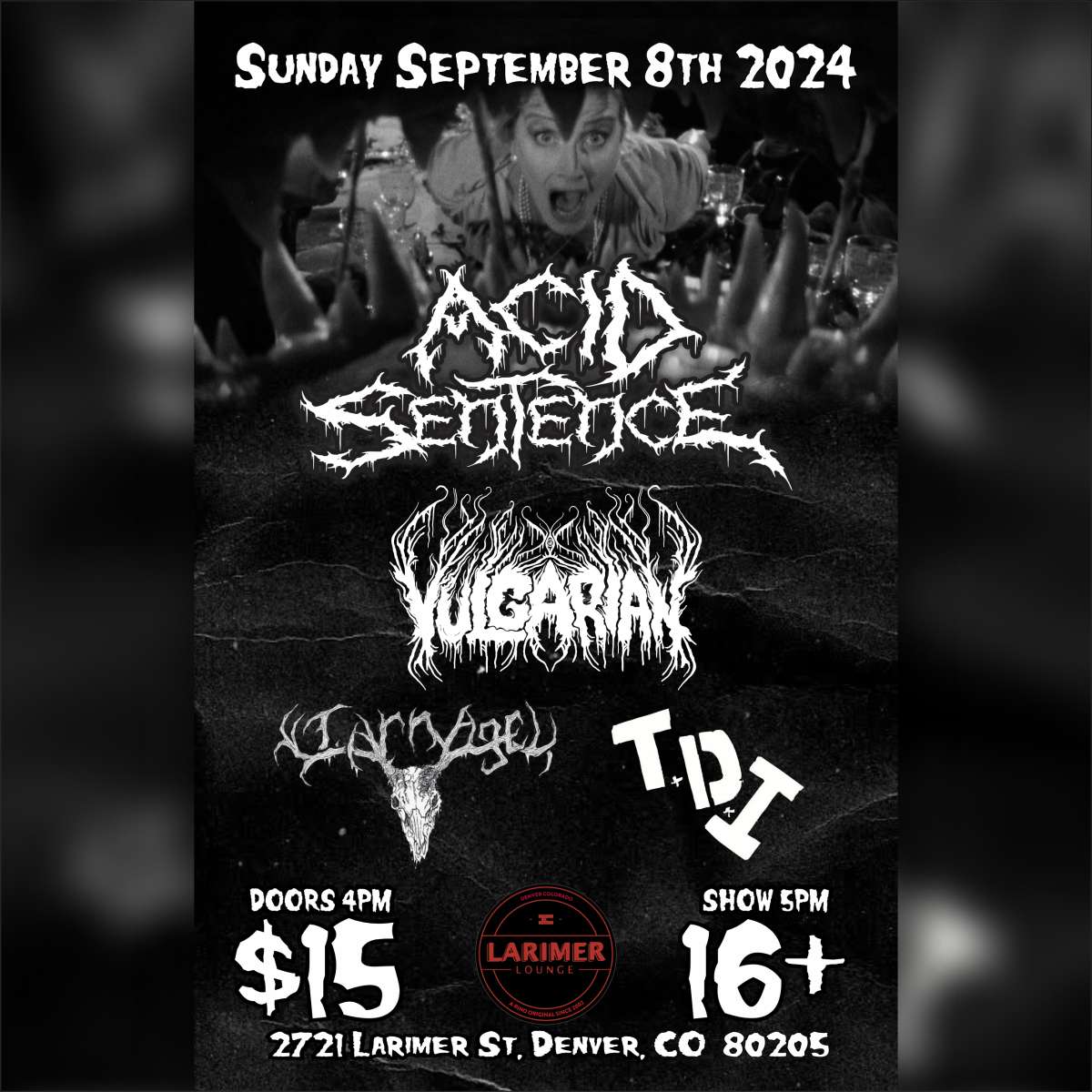 Larimer Lounge Presents Vulgarian with TARNAGE, T.D.I and Acid Sentence on Sunday, September 8th. - All ages, ticketed guests under 16 admitted with ticketed guardian
