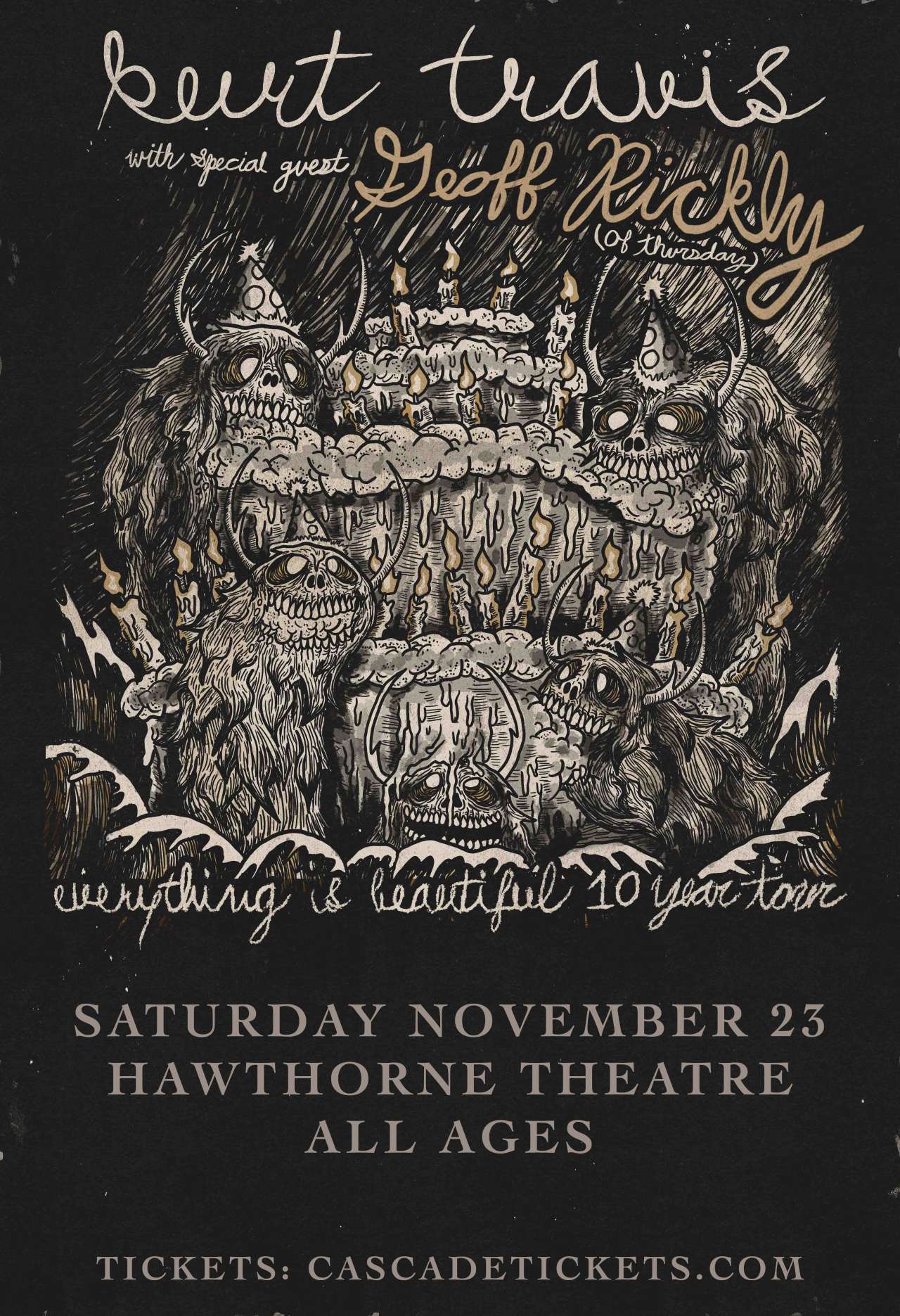 Mammoth NW Presents: Kurt Travis: Everything Is Beautiful 10 Year Tour w/ Geoff Rickly, Dwellings & Predisposed Saturday, November 23rd, 2024 7:00PM Hawthorne Theatre All Ages | Bar w/ valid ID No refunds or exchanges. All sales final.