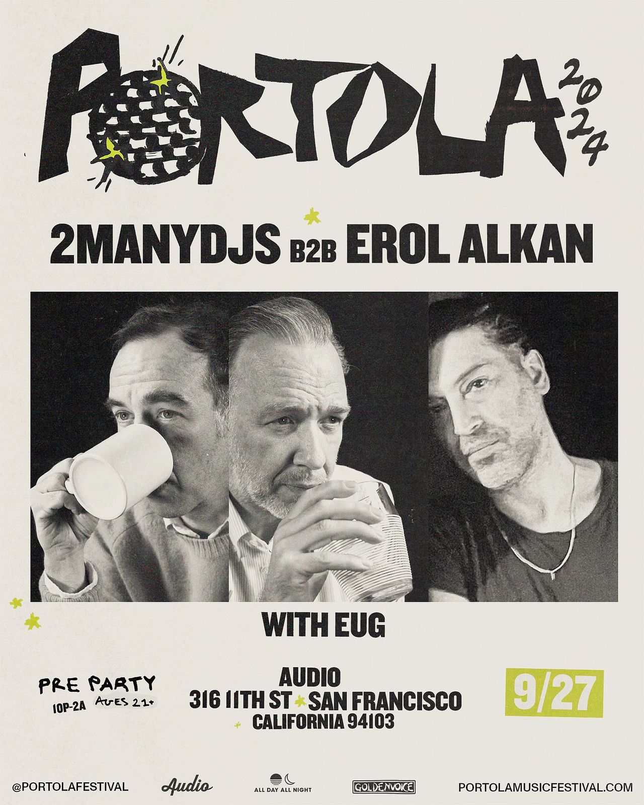 **Portola loyalty sale 8/21 at 12pm pst **General on sale 8/23 at 12pm pst A huge Portola Pre-Party hits Audio on 9/27 with 2MANYDJS b2b EROL ALKAN. Support by Eug 21+ event. All sales are final, no refunds.