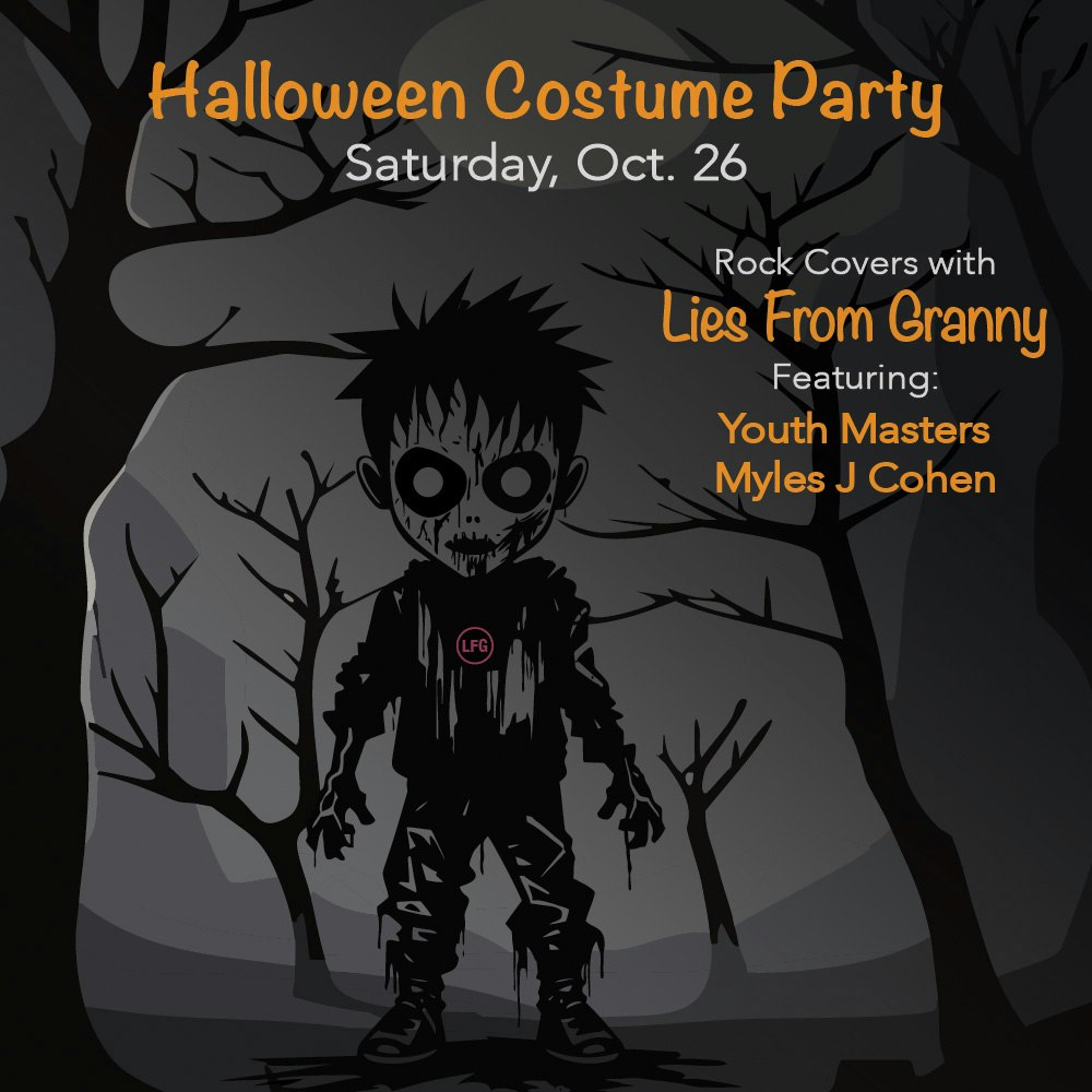 Halloween Costume Party and Rock Covers with Lies From Granny featuring Youth Masters and Myles J Cohen Presented by The 8x10. This is an 18+ event.
