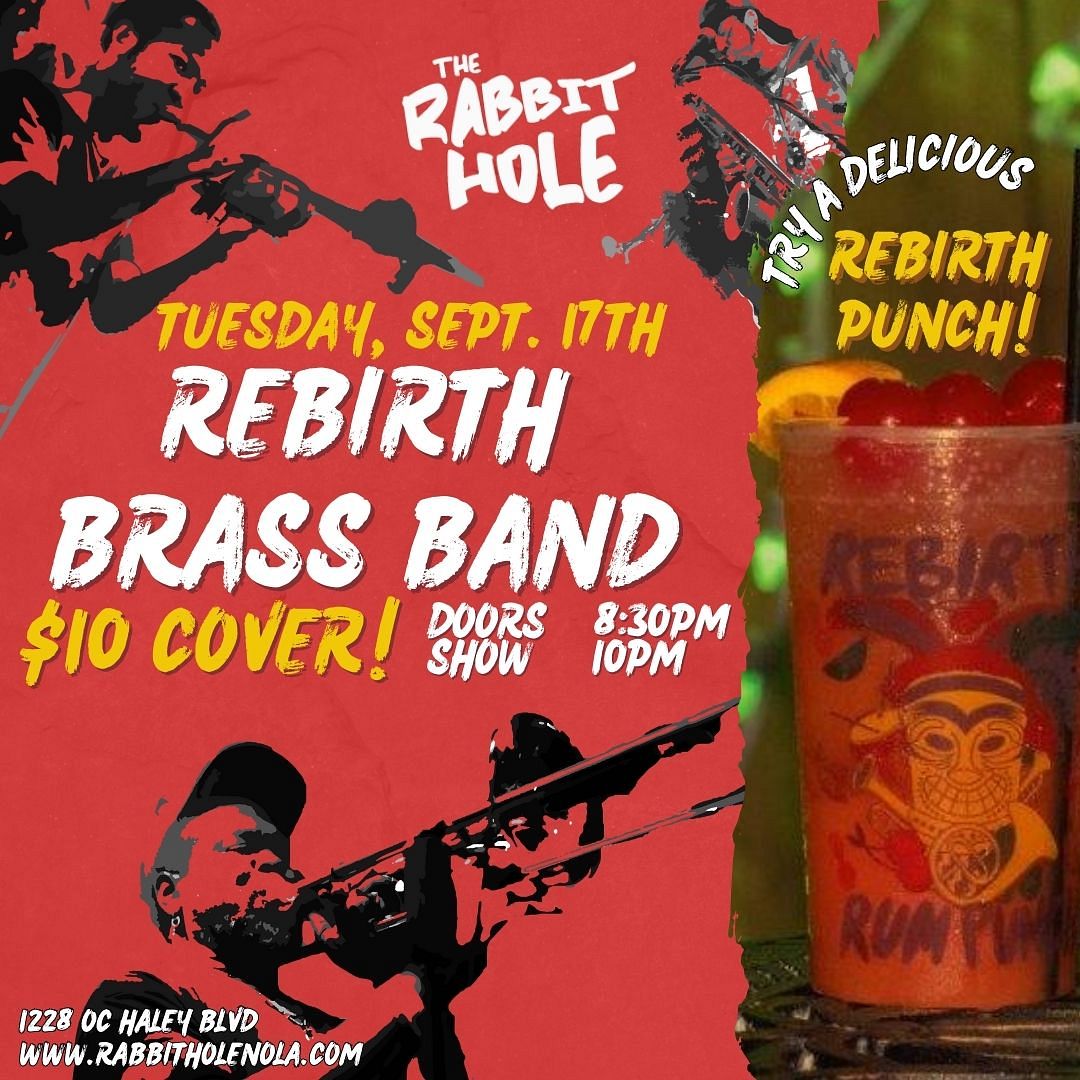Tuesday Nights at the Rabbit Hole! Featuring: @rebirthbraassband Doors at 8pm Rebirth Brass Band at 10:00PM + Food Vendor! Tickets $10 at the Door