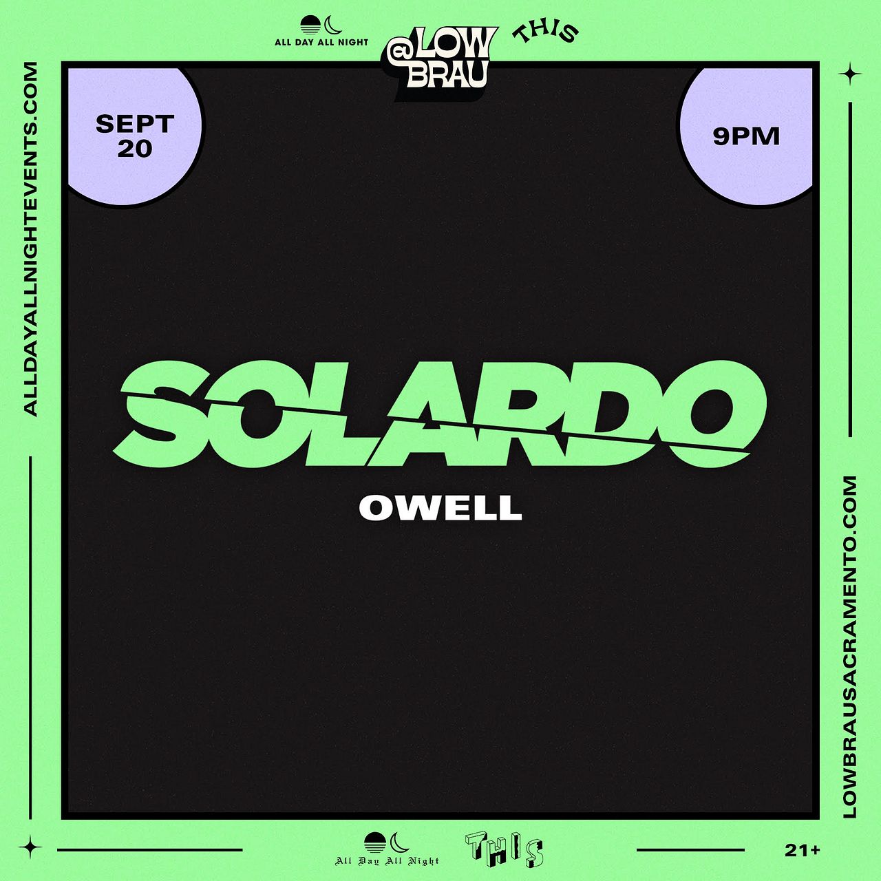 All Day All Night x THIS 916 present SOLARDO at LowBrau on Friday, September 20th! Get ready for anothe action packed night with a big name in this 360 degree setting. Support by Owell 21+ | 9pm | All sales are final, no refunds