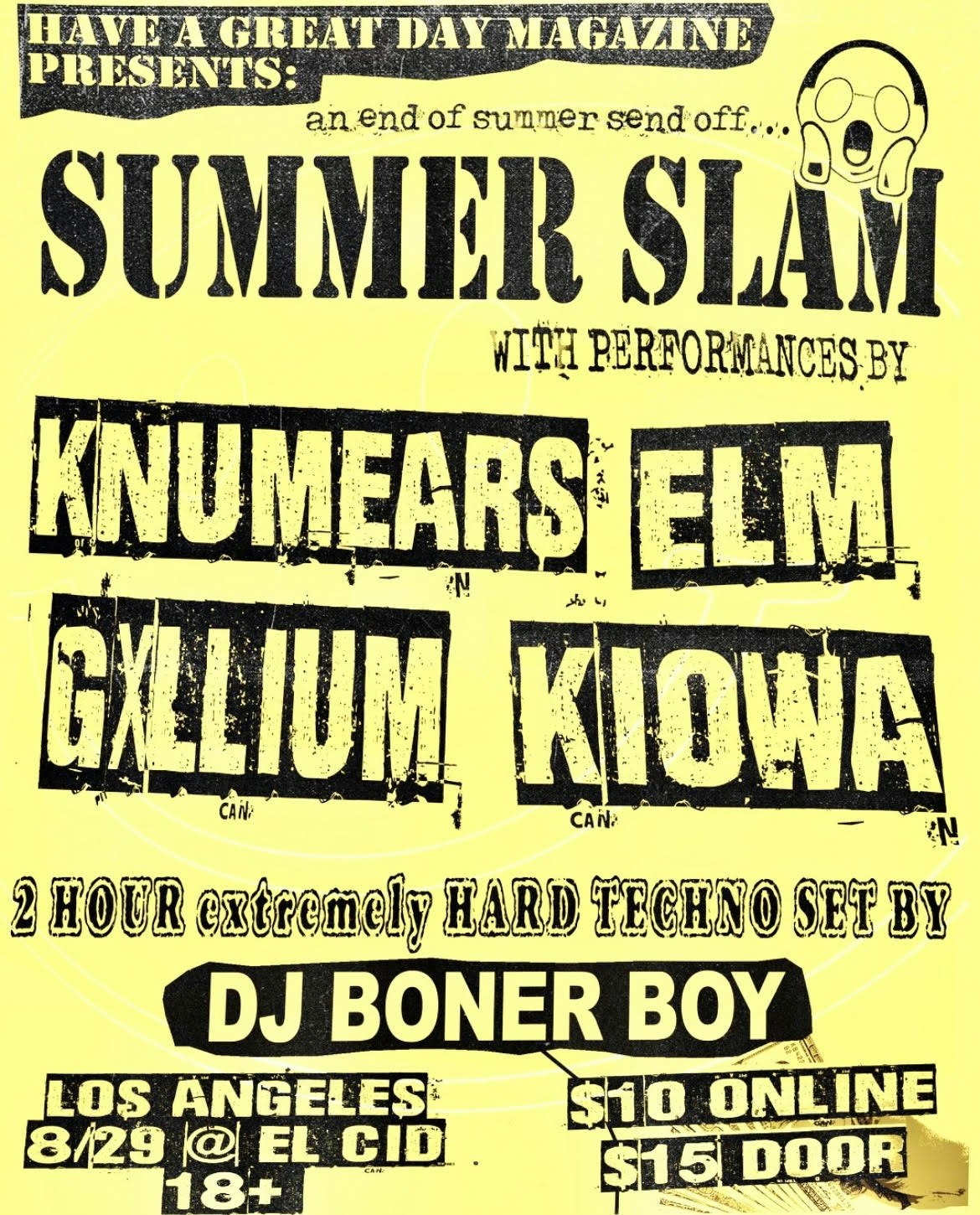 Have a Great Day Magazine Presents Summer Slam With performances by Knumears, Elm, Gxllium, Kiowa and a DJ set by DJ Boner Boy Presented by Have A Great Day Magazine. This is an 18+ event