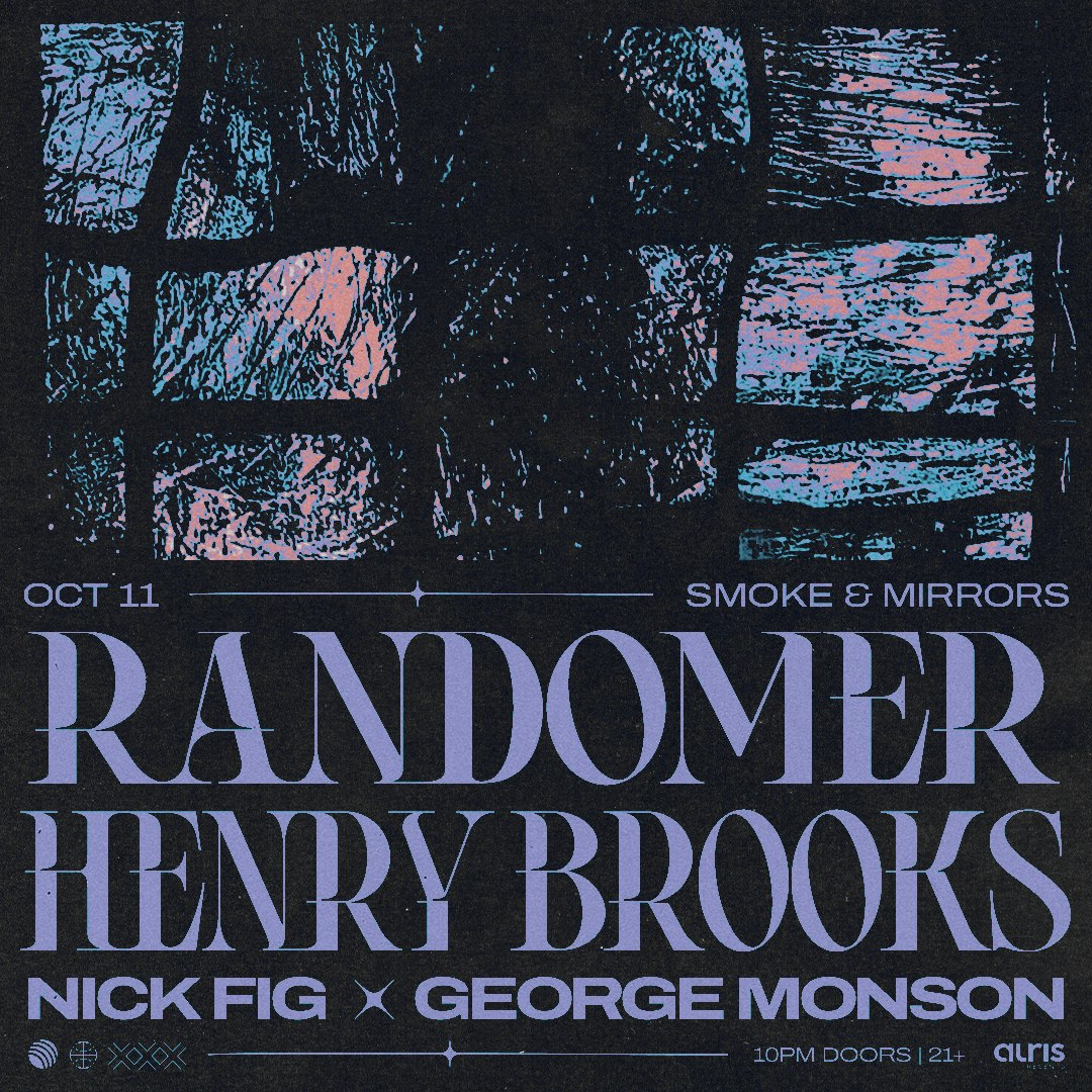 Friday, October 11th, 2024 Randomer Henry Brooks Nick Fig b2b George Monson 2045 N Milwaukee Ave Chicago, IL 60647 Doors 10pm - 21+ w/valid ID Presented by Smoke & Mirrors. This is a 21+ event