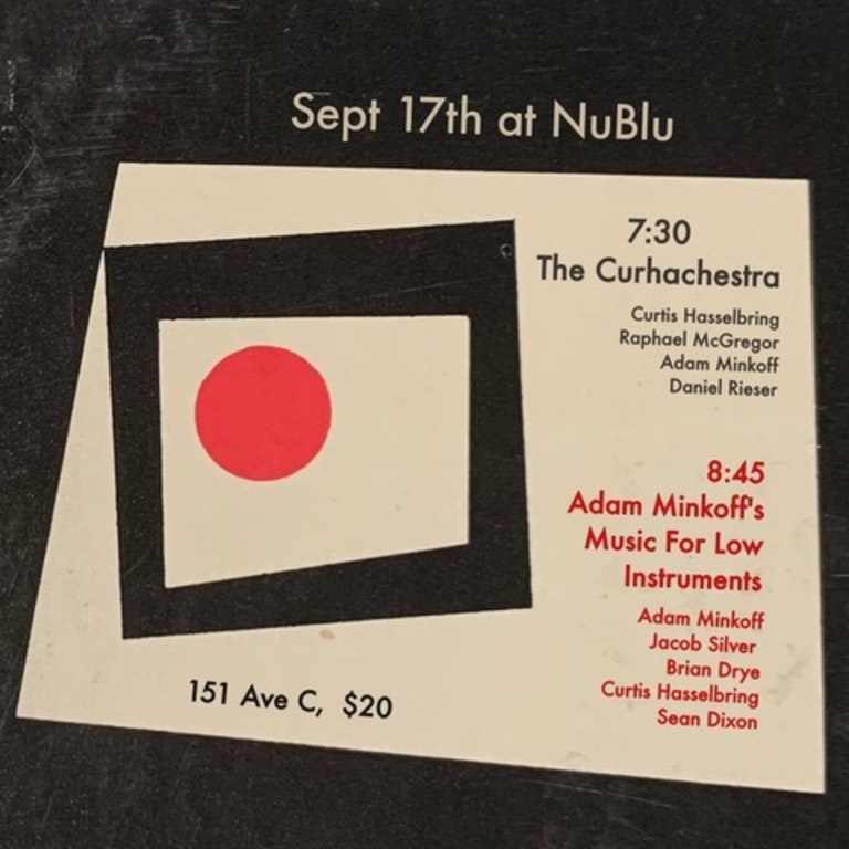 \-The Curhachestra Curtis Hasselbring, Raphael McGregor, Adam Minkoff, Daniel Reiser \-Adam Minkoff's Music for Low Instruments Adam Minkoff, Jacob Silver, Brian Drye, Curtis Hasselbring, Sean Dixon Presented by Nublu. This is a 21+ event