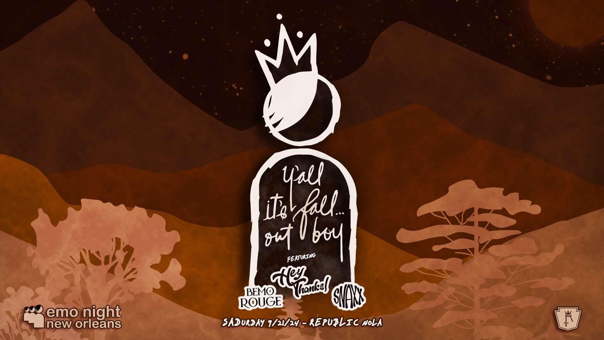 Y’all, it’s Fall… Out Boy! Don’t miss a special edition of EMO NIGHT to usher in Spooky Season and celebrate one of the greatest pop-punk / emo acts of all time, FALL OUT BOY, with a special live set from Hey Thanks! and all your favorite emo singalongs from your emo night residents, Bemo Rouge & SNAXX, (with a double dose of FOB) on SADurday 9/21 at Republic NOLA! So, grab your favorite Fallout Boy or Girl and get ready to Dance Dance, because Sugar, we’re going down swinging and we’re already thankful for the memories!