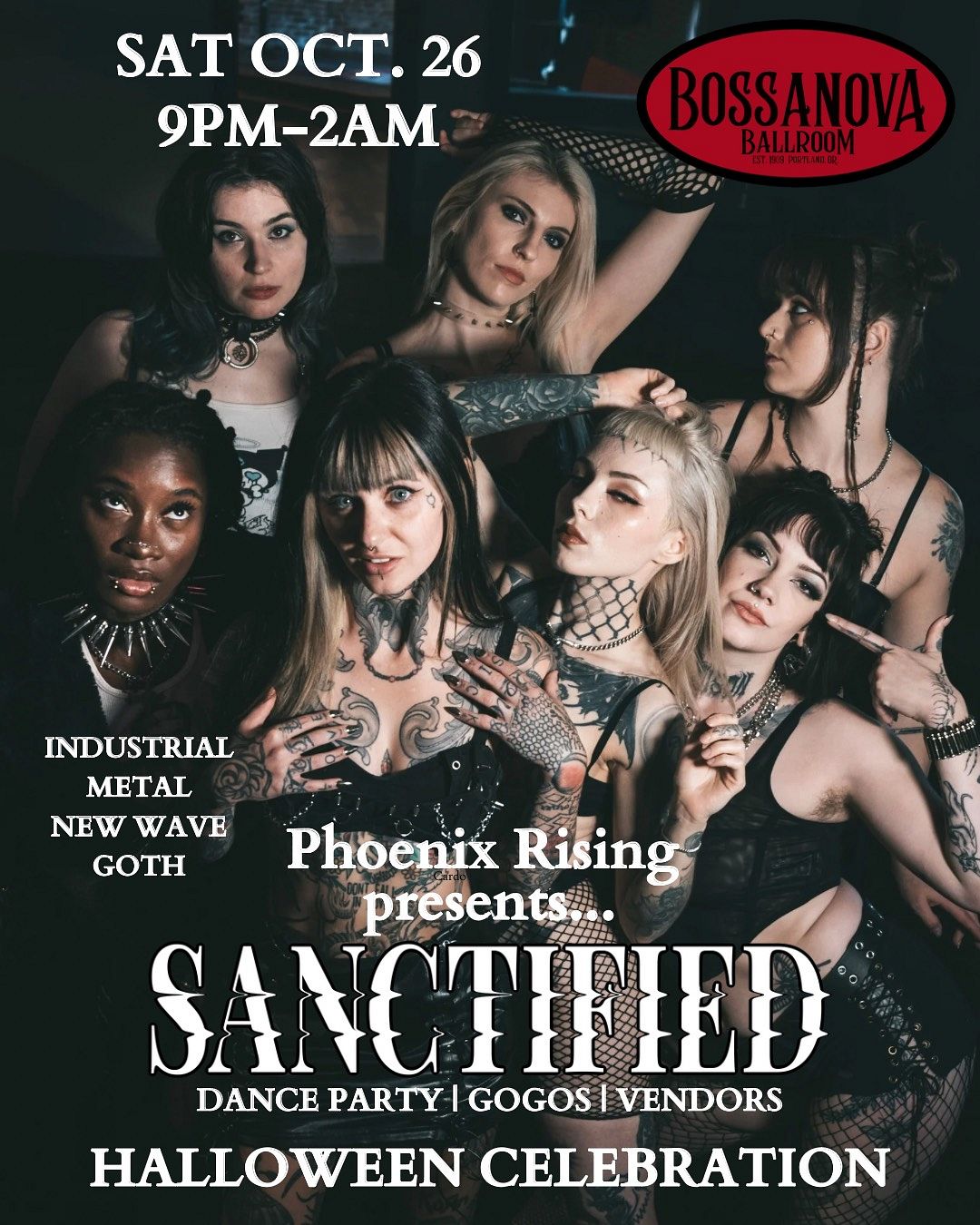 Phoenix Rising Presents: Sanctified Industrial, Metal, Dark Wave, Goth Dance Party! Vendors! GoGos! Saturday Oct 26th, 2024 Doors at 9PM || 21+ ONLY Bossanova Ballroom 722 E Burnside St, Portland, OR 97214