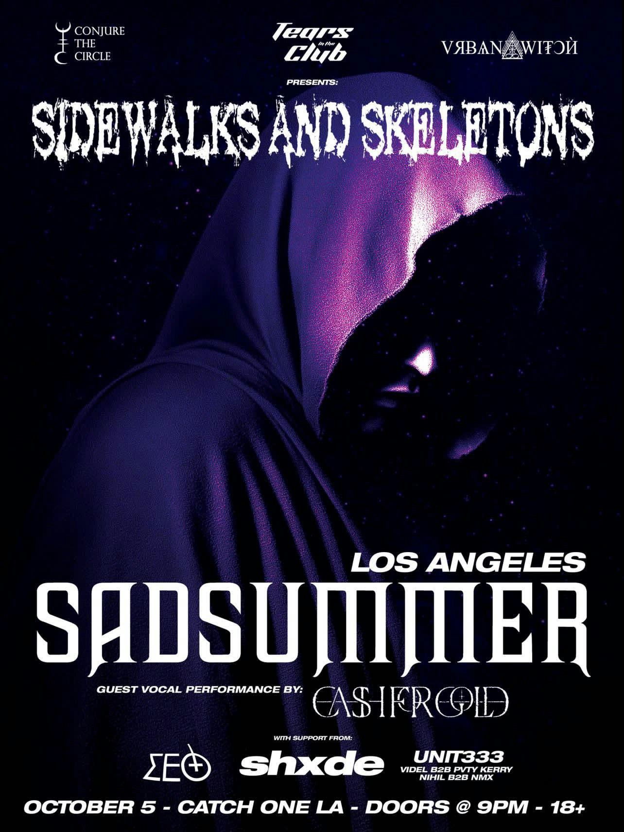Tears in the Club in conjunction with Vrban Witch and Conjure The Circle present Sad Summer, featuring Sidewalks and Skeletons in his first LA appearance in over 5 years. Hardwave legend shxde also makes his LA debut with support from SET and unit333. Expect the mourning of the passage of summer to cave and crumble under the darkly emotional reverberating bass and soul piercing saws of witch house, hardwave and dark electronic incantations all night long.