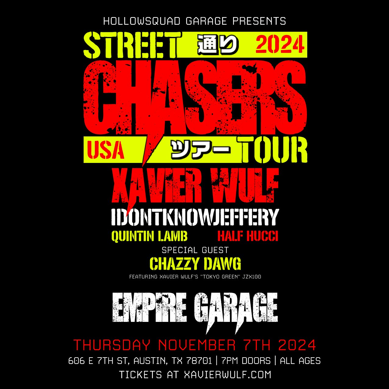 Hollowsquad Garage presents Xavier Wulf live in Austin Texas at Empire Garage on November 7th! With IdontKnowJeffery and Quintin Lamb + special guests Hollowsquad Garage presents All ages