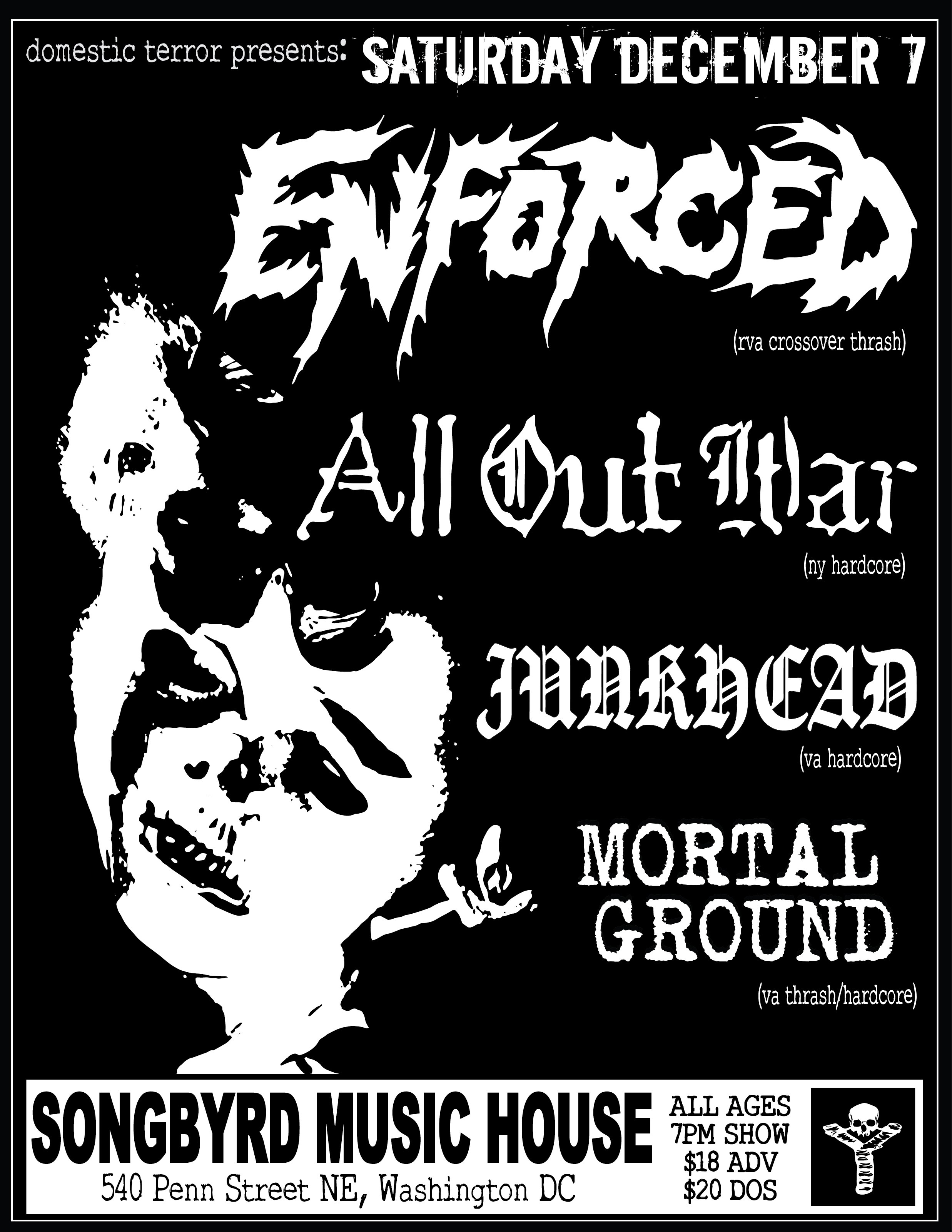 "Enforced & All Out War. Two giants are coming to DC!! RIchmond's crossover thrash metal monsters are coming up to DC for a stacked bill with the mighty All Out War from New York! Hardcore and Thrash unite! Local homies Junkhead and Mortal Ground will get the thing started. Spread the word!"