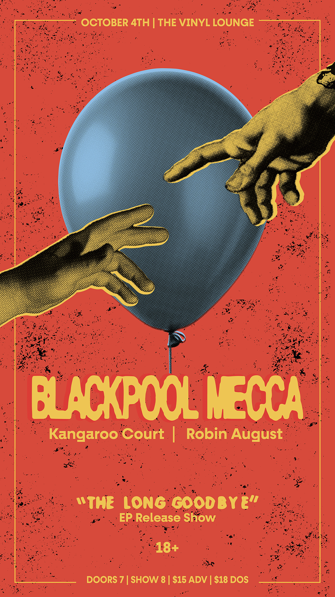Join us at The Vinyl Lounge for Blackpool Mecca w/ support from Kangaroo Court and Ergo Brea!