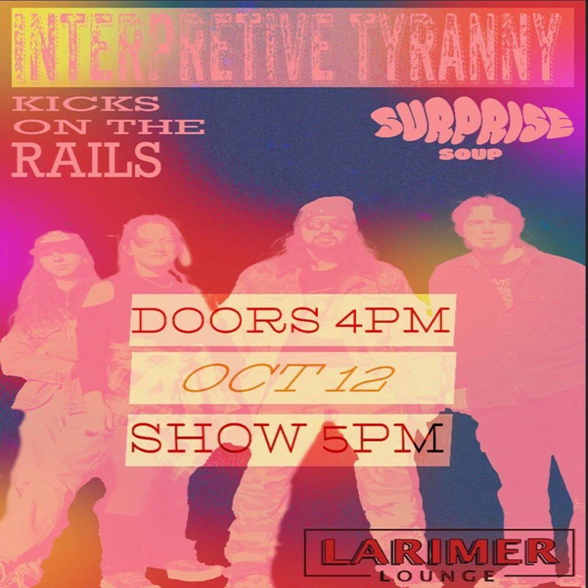 Larimer Lounge Presents Interpretive Tyranny with Surprise Soup and Kicks On the Rails on Saturday, October 12th. - All ages, ticketed guests under 16 admitted with ticketed guardian