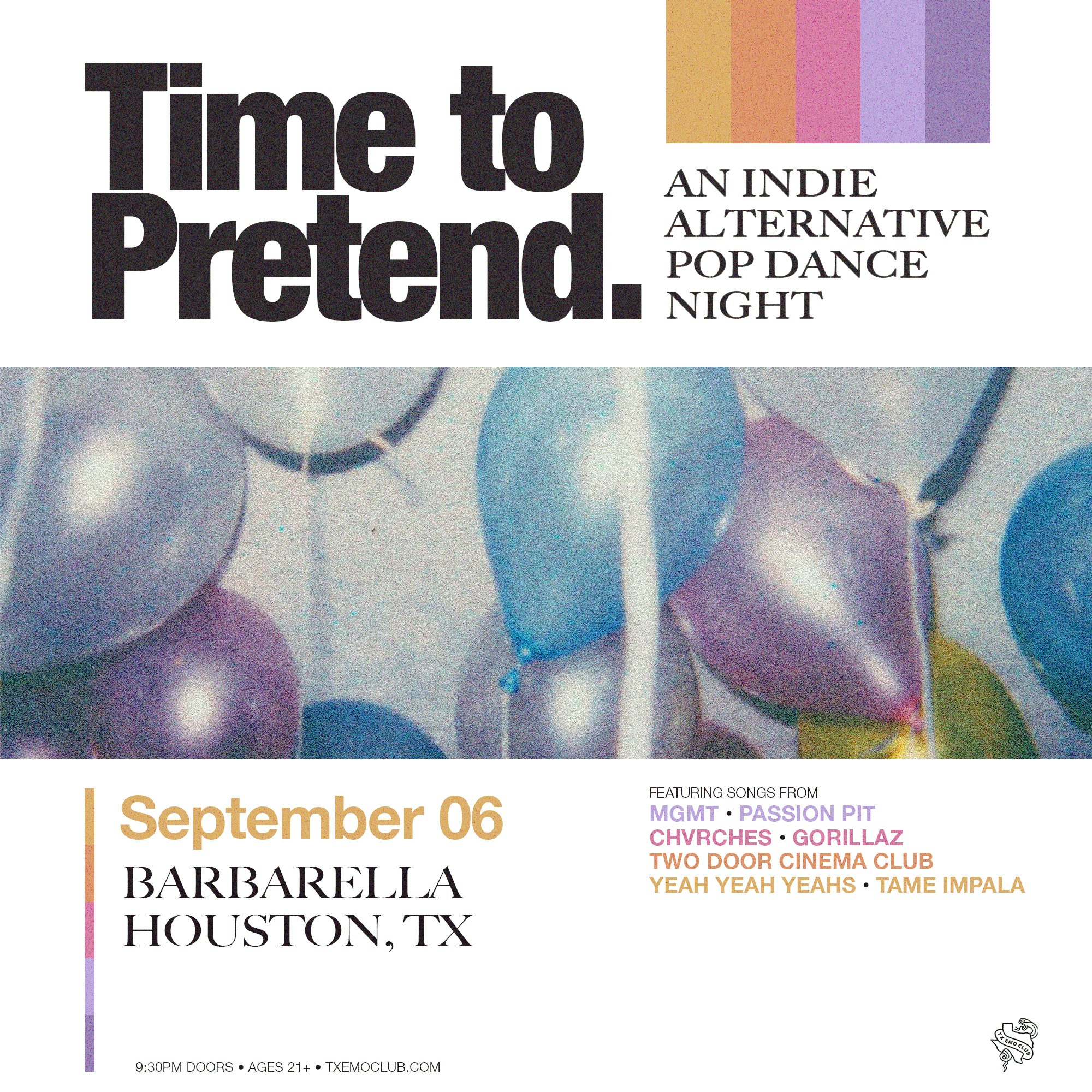 TIME TO PRETEND ~ 2010s INDIE SLEAZE / POP DANCE PARTY Presented by Texas Emo Club. This is a 21+ event.