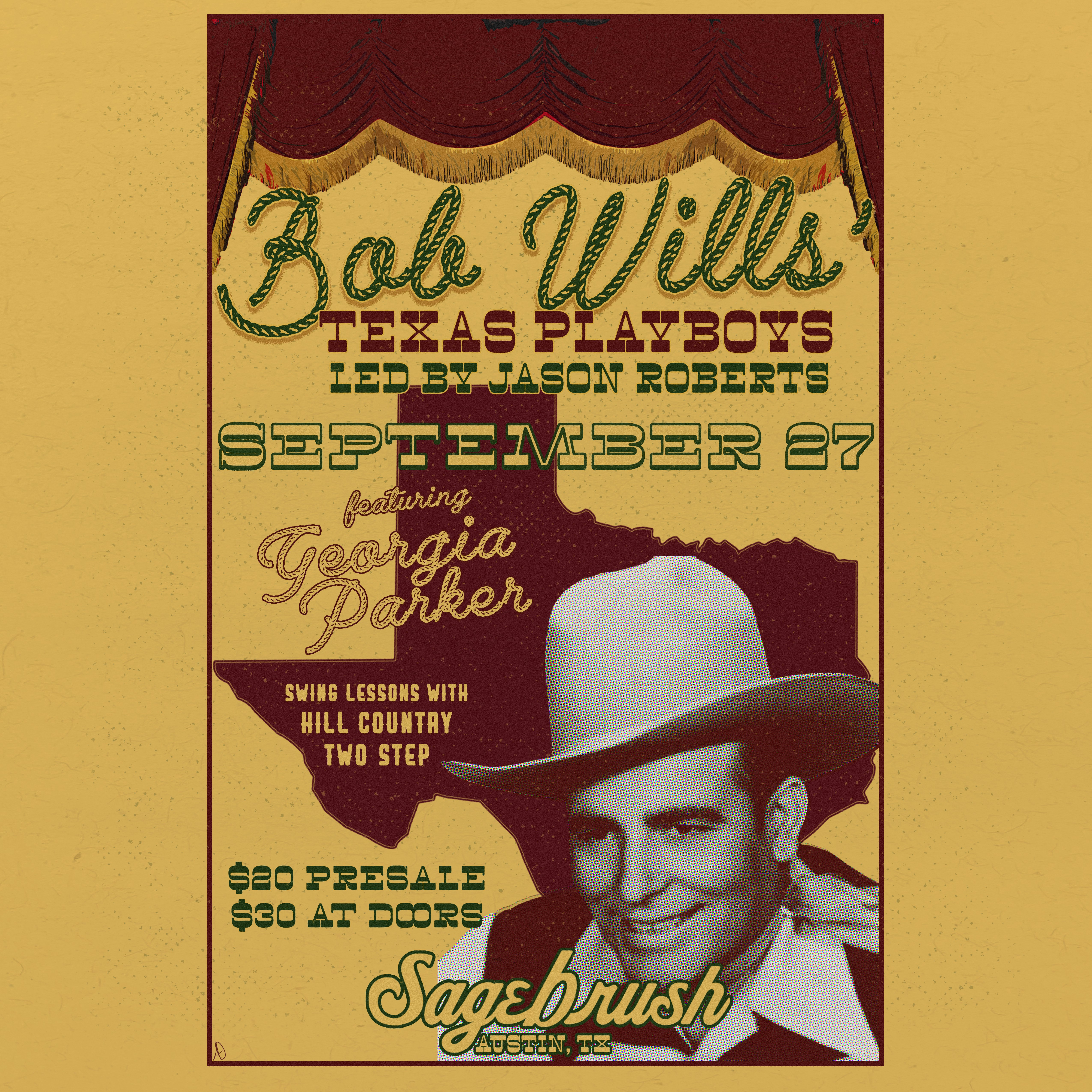 Bob Wills Texas Playboys under the direction of Jason Robert's live Friday September 27th Presented by Sagebrush This is a 21+ event