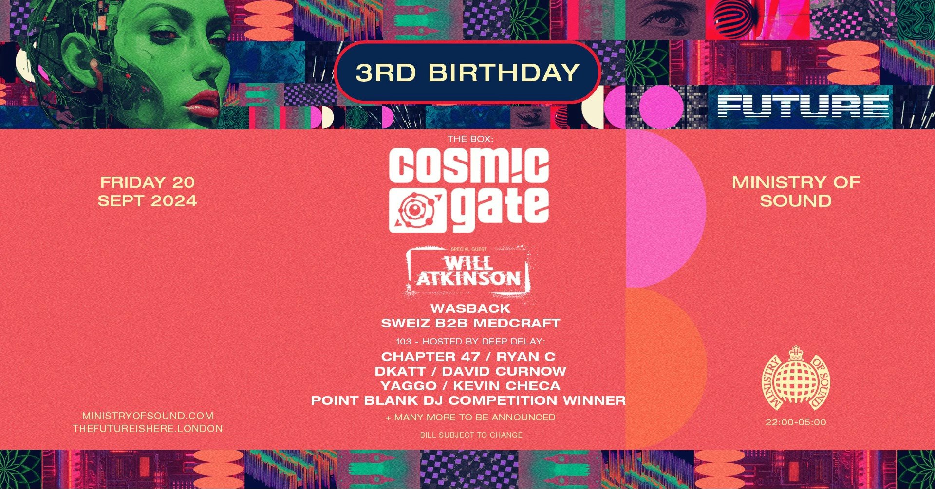 Trance legends Cosmic Gate will be returning to Ministry of Sound to perform for FUTURE's 3rd Birthday show alongside Will Atkinson and many more talented artists across all four rooms! Presented by Ministry Of Sound. This is an 18+ event
