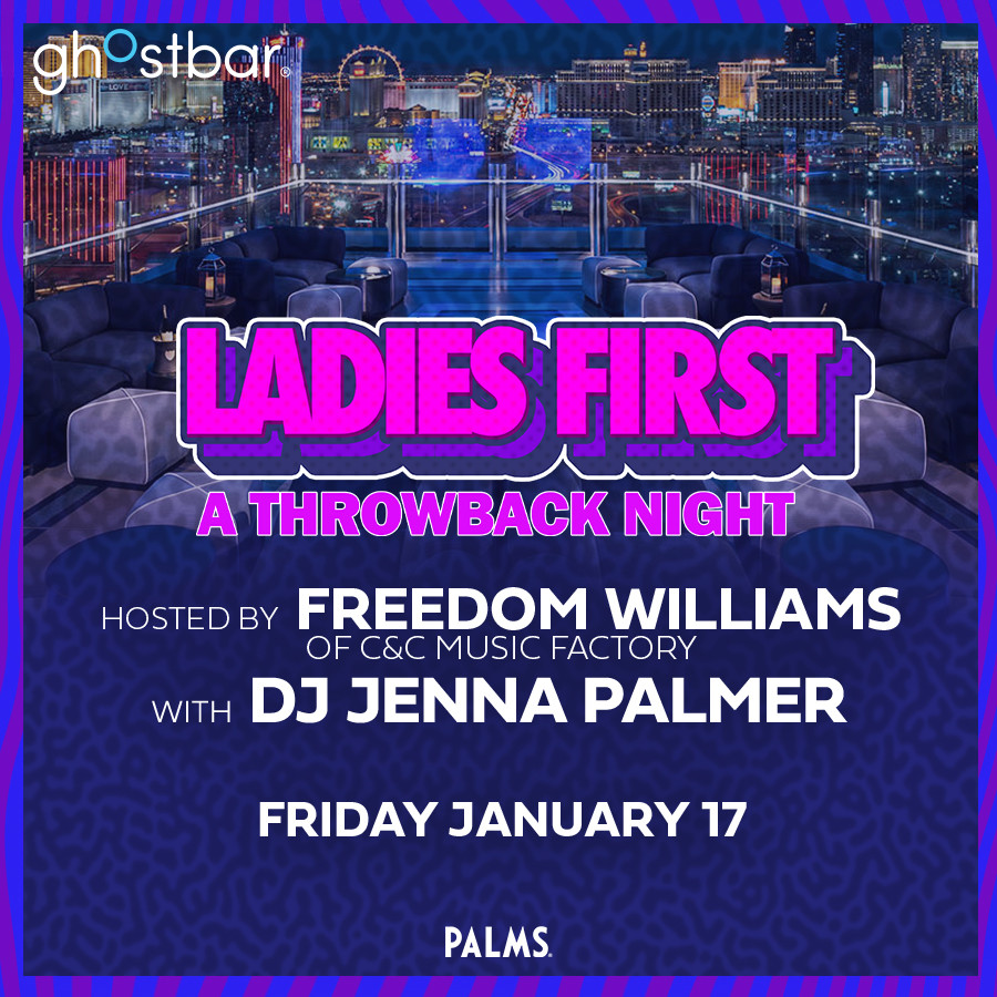 Ghostbar and the Palms Hotel and Casino Resort presents "Ladies First" Fridays. Doors open at 9pm with complimentary admission for everyone and all ladies will receive their first glass of champagne FREE before 11pm. C&C Music Factory's Freedom Williams will be performing live alongside of DJ Jenna Palmer spinning all the hits of the 80's, 90's, and early 2000's. Must be 21 and over with proper I.D. Entertainment Subject to change Management Reserves All Rights