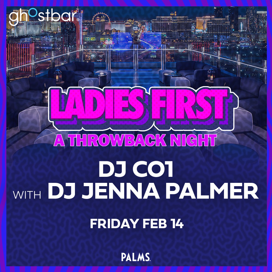 Ghostbar and the Palms Hotel and Casino Resort presents "Ladies First" Fridays. Doors open at 9pm with complimentary admission for everyone and all ladies will receive their first glass of champagne FREE before 11pm. Come celebrate Valentine's Day with a special Woodford Bourbon and chocolates tasting. Resident DJ Jenna Palmer will be joined by DJ CO1 playing all the hits of the 80's, 90's, and early 2000's. Must be 21 and over with proper I.D. Entertainment Subject to change Management Reserves All Rights