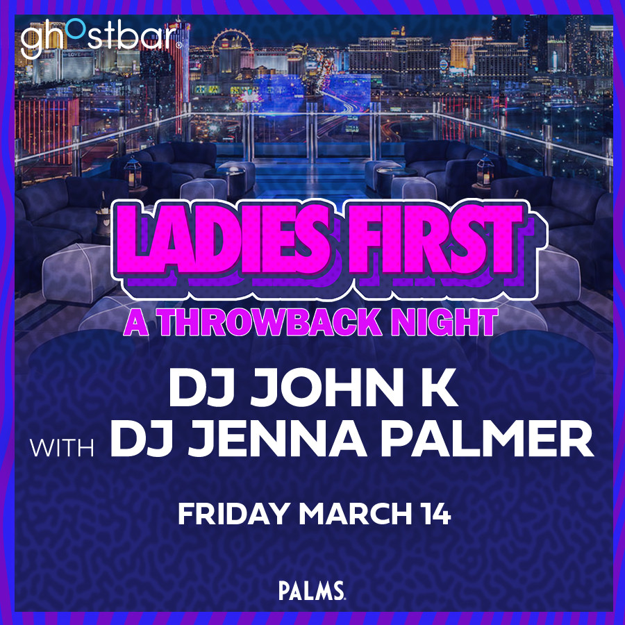 Ghostbar and the Palms Hotel and Casino Resort presents "Ladies First" Fridays. Doors open at 9pm with complimentary admission for everyone and all ladies will receive their first glass of champagne FREE before 11pm. Resident DJ Jenna Palmer will be joined by DJ John K, playing all the hits of the 80's, 90's, and early 2000's. Must be 21 and over with proper I.D. Entertainment Subject to change Management Reserves All Rights