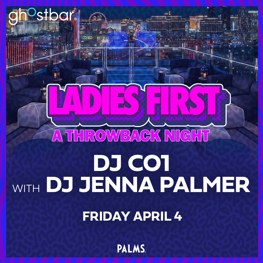 Ghostbar and the Palms Hotel and Casino Resort presents "Ladies First" Fridays. Doors open at 9pm with complimentary admission for everyone and all ladies will receive their first glass of champagne FREE before 11pm. Resident DJ Jenna Palmer will be joined by DJ CO1 from 100.5fm playing all the hits of the 80's, 90's, and early 2000's. Must be 21 and over with proper I.D. Entertainment Subject to change Management Reserves All Rights