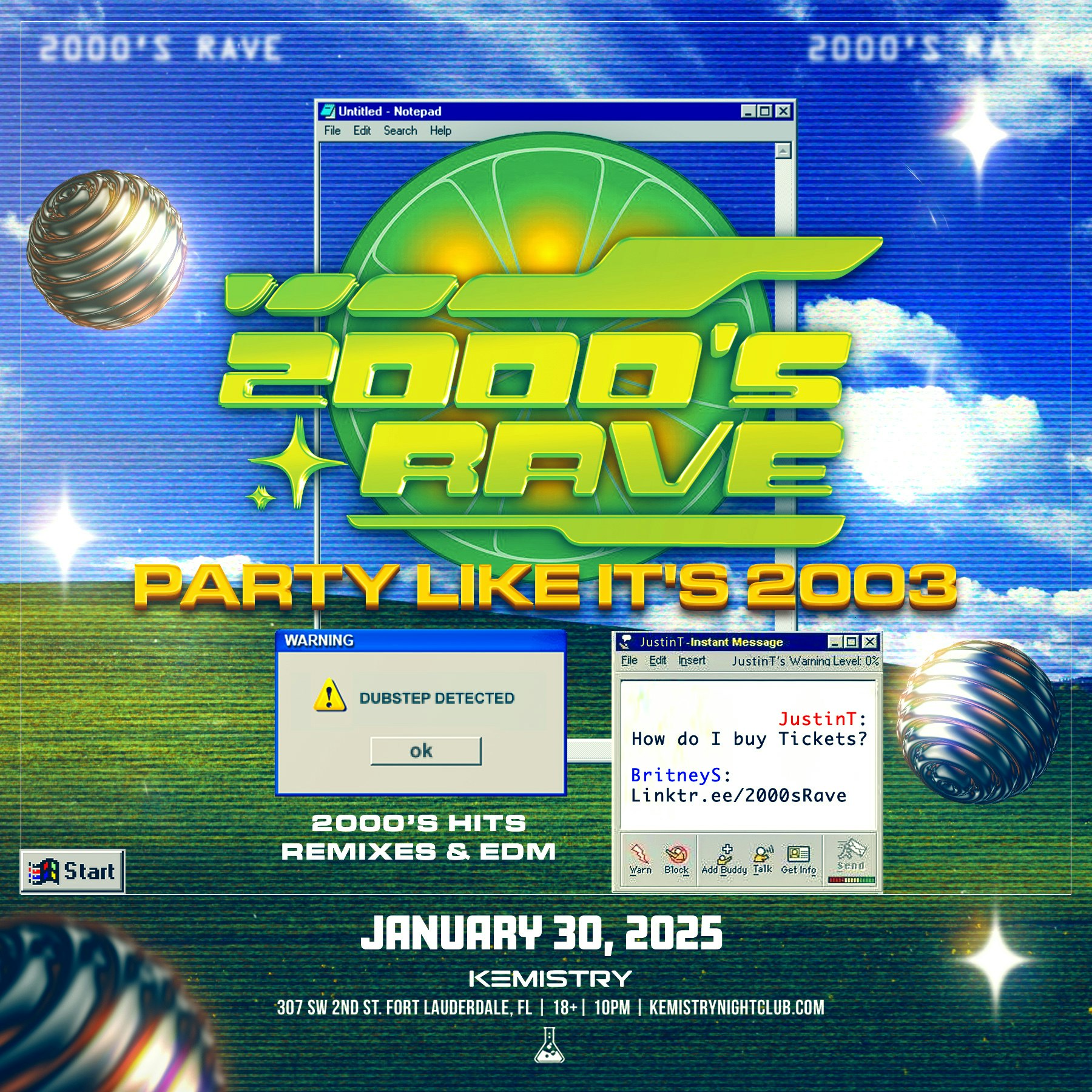 The 2000's Rave is coming to Kemistry Nightclub for an unforgettable night. Get ready to come bond with us! For table reservations please email/text: VIP@kemistrynightclub.com (954) 297- 9255 Presented by Kemistry. This is an 18+ event