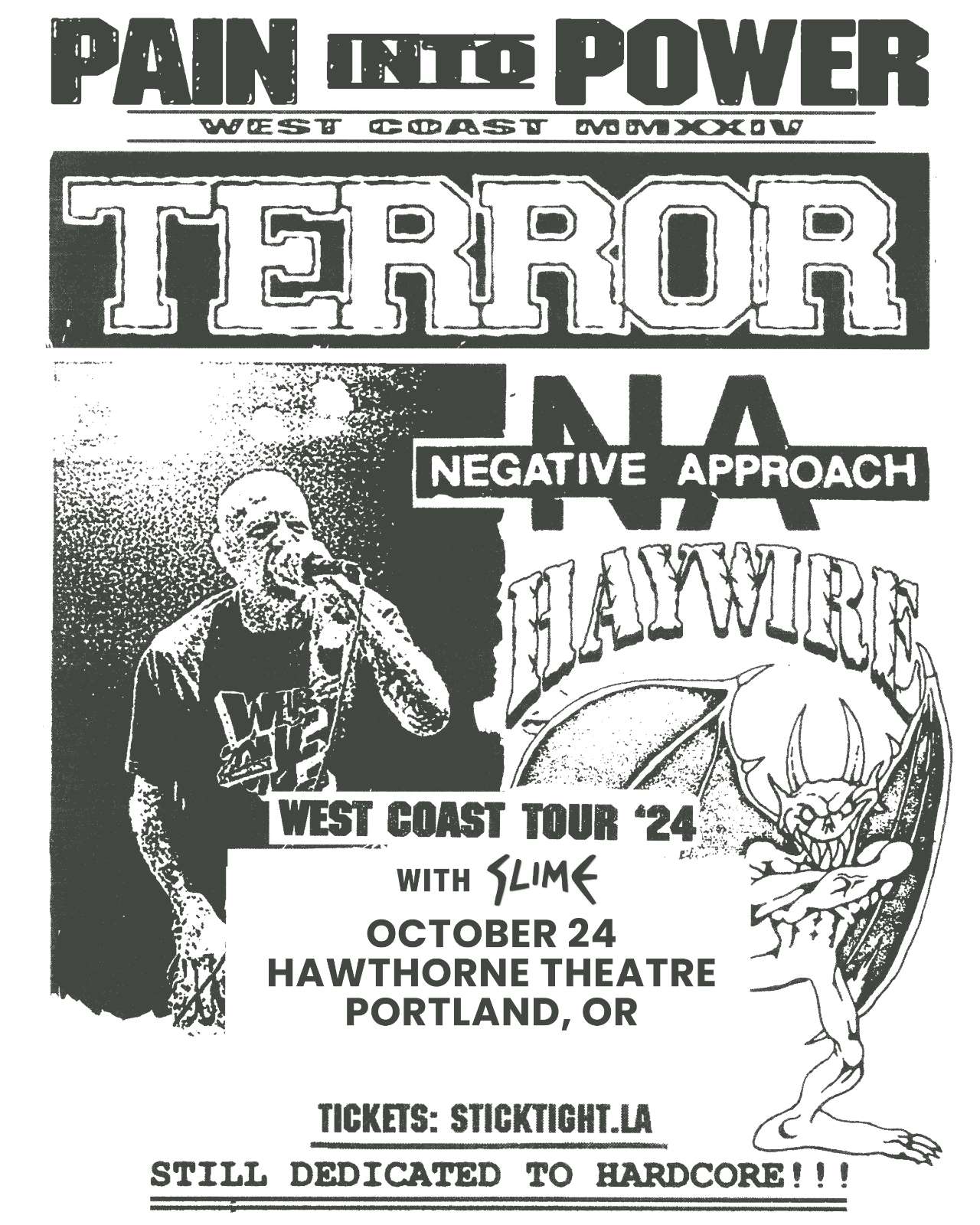 Mammoth NW Presents: TERROR w/ Negative Approach, Haywire & Slime Thursday, October 24th, 2024 7:00PM Hawthorne Theatre All Ages | Bar w/ valid ID No refunds or exchanges. All sales final.