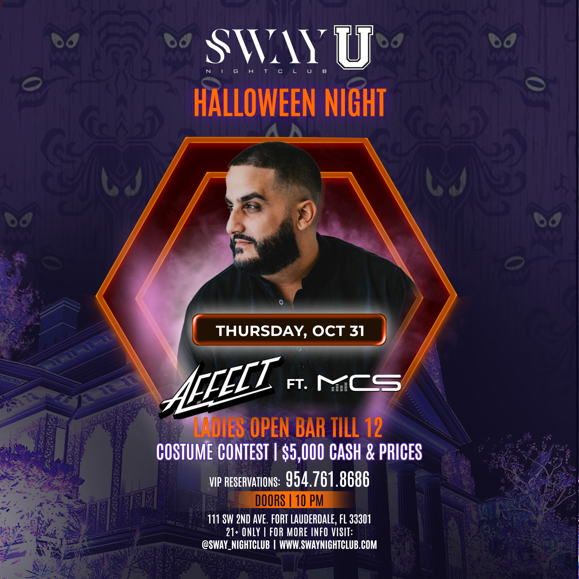HALLOWEEN NIGHT THURSDAY NIGHTS are when we start the weekend here at SWAY Nightclub LADIES DRINK FREE FROM 10pm-12am! $5,000 COSTUME CONTEST IN CASH & PRIZES *RESERVATIONS ENCOURAGED* Doors 10pm | 21+ | SOUNDS BY DJ AFFECT