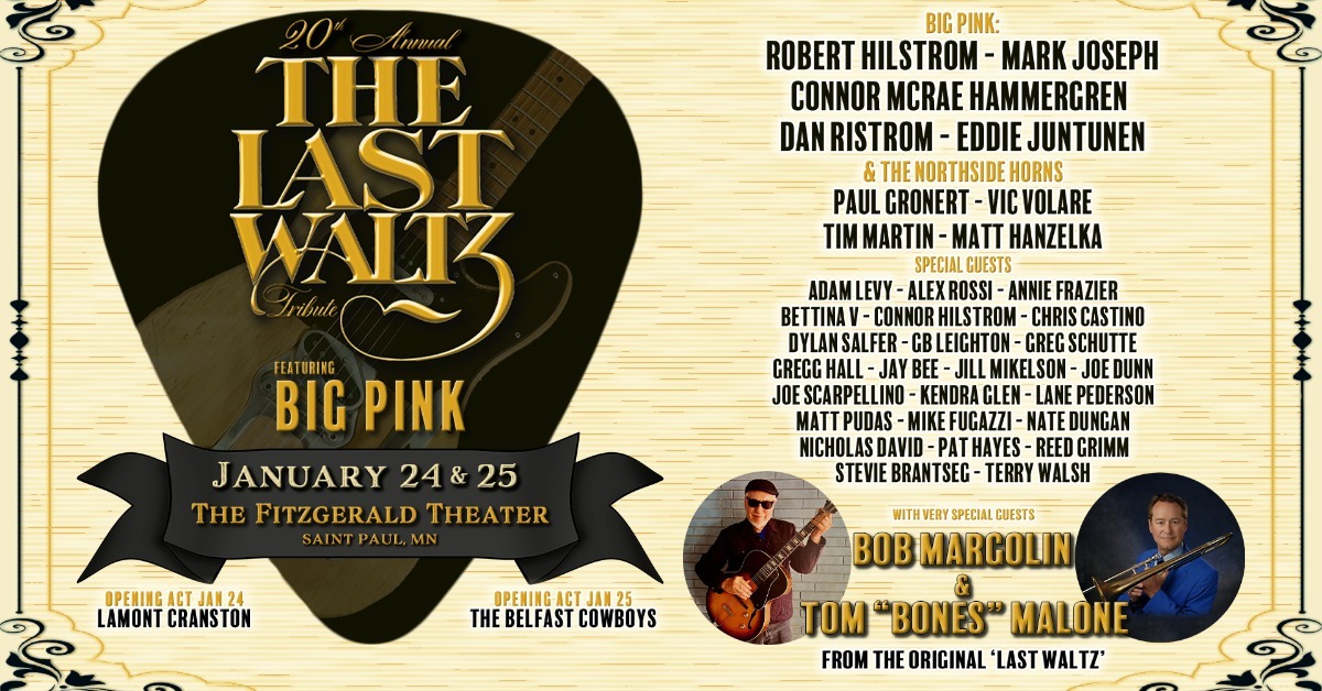 Big Pink: Robert Hilstrom, Mark Joseph, Connor McRae Hammergren, Dan Ristrom, Eddie Juntunen, and The Northside Horns (Paul Gronert, Vic Volare, Tim Martin, and Matt Hanzelka) and special guests Adam Levy, Alex Rossi, Annie Frazier, Bettina V, Connor Hilstrom, Chris Castino, Dylan Salfer, GB Leighton, Greg Schutte, Gregg Hall, Jay Bee, Jill Mikelson, Joe Dunn, Joe Scarpellino, Kendra Glen, Lane Pederson, Matt Pudas, Mike Fugazzi, Nate Dungan, Nicholas David, Pat Hayes, Reed Grimm, Stevie Brantseg, Sonny Early, Maurice Jacox, Molly Maher, Craig Clark, and Terry Walsh and with very special guest Tom “Bones” Malone (from the original Last Waltz).
