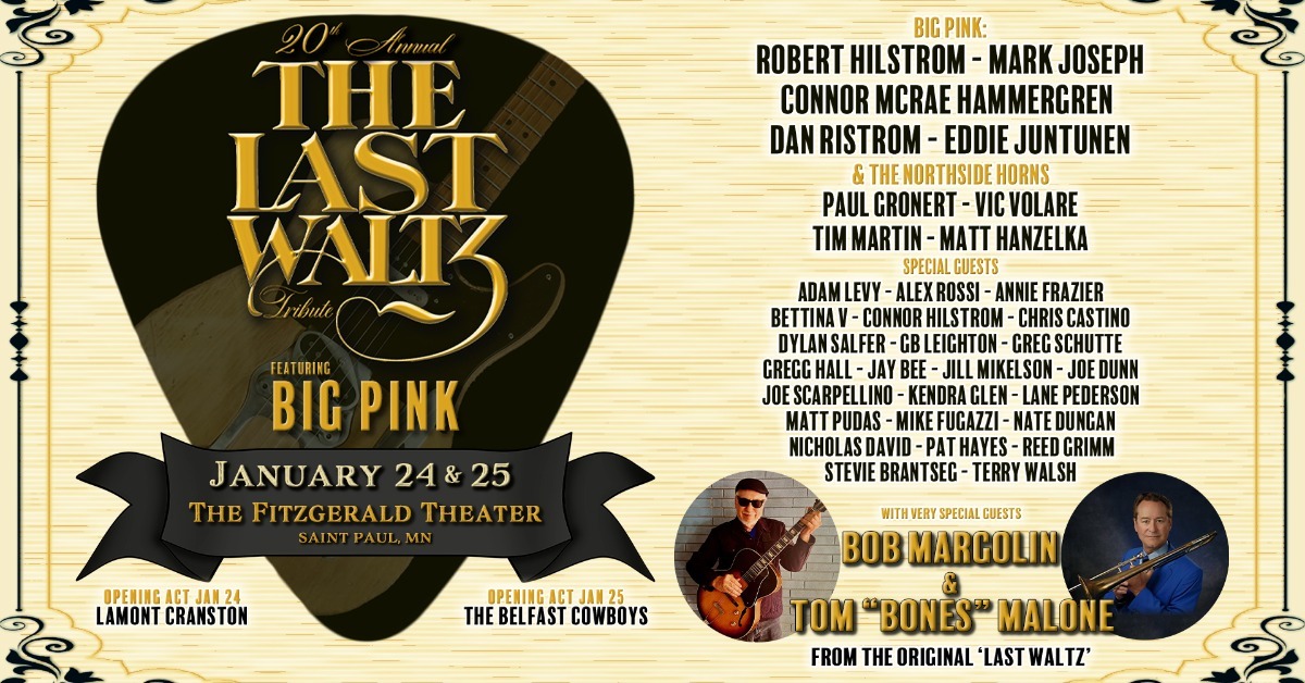 Big Pink: Robert Hilstrom, Mark Joseph, Connor McRae Hammergren, Dan Ristrom, Eddie Juntunen, and The Northside Horns (Paul Gronert, Vic Volare, Tim Martin, and Matt Hanzelka) and special guests Adam Levy, Alex Rossi, Annie Frazier, Bettina V, Connor Hilstrom, Chris Castino, Dylan Salfer, GB Leighton, Greg Schutte, Gregg Hall, Jay Bee, Jill Mikelson, Joe Dunn, Joe Scarpellino, Kendra Glen, Lane Pederson, Matt Pudas, Mike Fugazzi, Nate Dungan, Nicholas David, Pat Hayes, Reed Grimm, Stevie Brantseg, Sonny Early, Maurice Jacox, Molly Maher, Craig Clark, and Terry Walsh and with very special guest Tom “Bones” Malone (from the original Last Waltz).