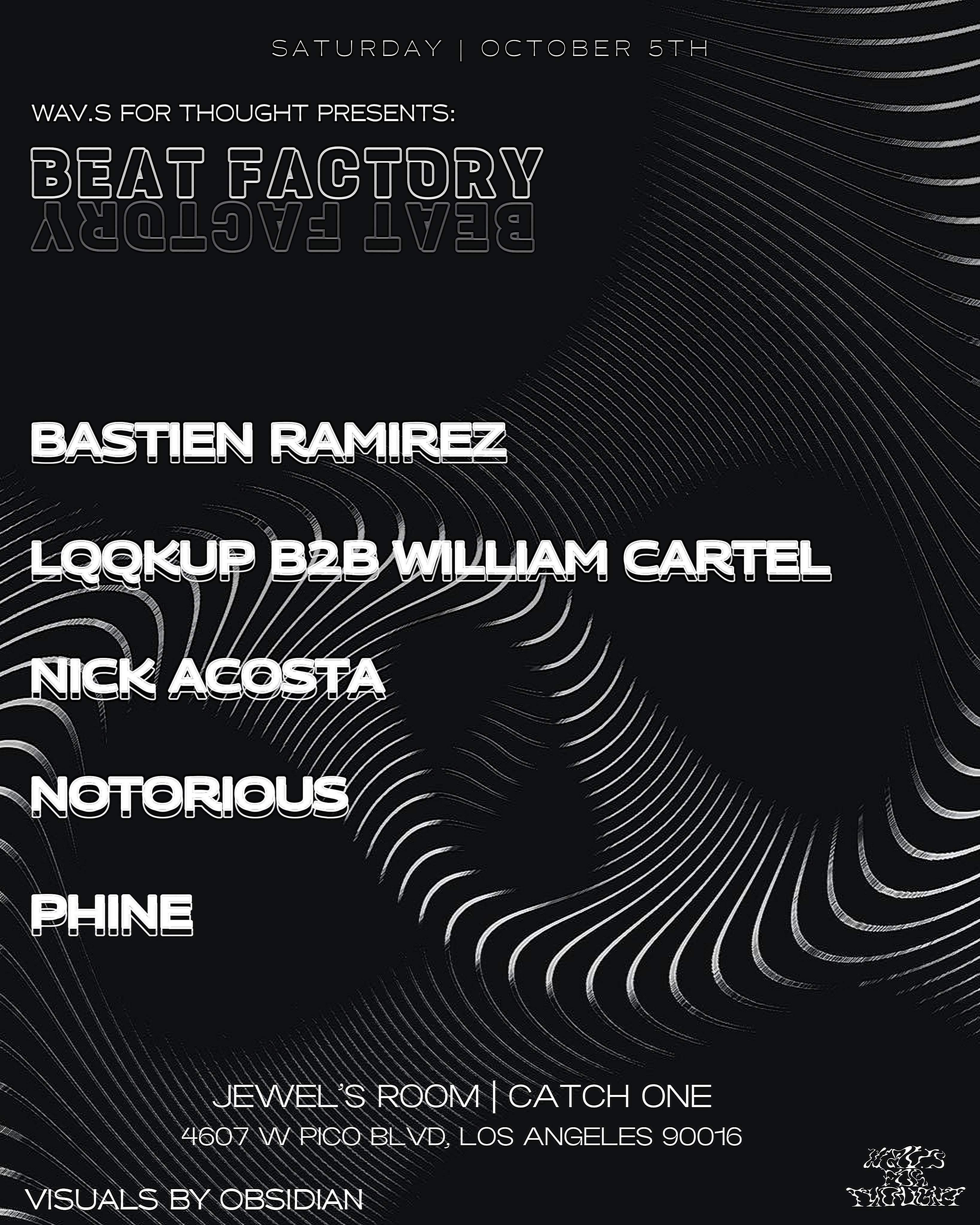 BEAT FACTORY is a new event presented by WAV.S FOR THOUGHT. Giving house music its own shine. Our artists curated a line up that’ll serve underground grooves be knocking throughout the night. Presented by WAV.S FOR THOUGHT This is an 21+ event