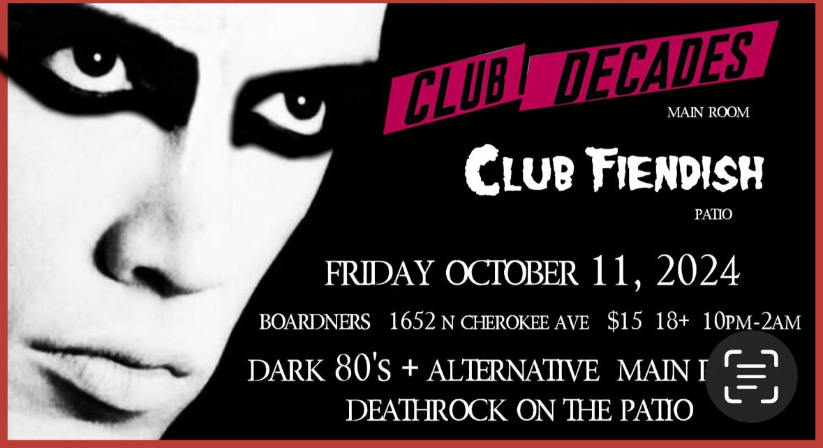 Club Fiendish 10/11 @ Boardner’s Club Fiendish Friday, Oct 11 1652 N Cherokee Ave, Hollywood. 10pm, 18+ Join us Friday October 11 as Club Fiendish takes over the Patio Room at Club Decades. Two rooms of music & dancing. Two clubs in one!