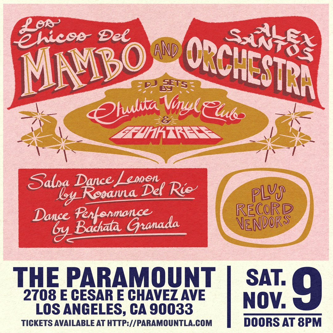 Los Chicos del Mambo + Alex Santos Orchestra - DJ Sets by: Chulita Vinyl Club & GFunk Trece - Salsa Dance Lessons by: Rosanna Del Río - Dance Performance by: Bachata Granada Plus Vinyl Vendors & more! all ages | 8pm - Pricing structure: Early bird - $15 + fees = $18.03 (first 7 days) First release - $20 + fees = $23.69 (10/1 - 11/1) Second release - $21 + fees = $25 (11/1 - 11/8) Final Release - $23 + fees = $27 (11/9 online) Presented by The Paramount All ages