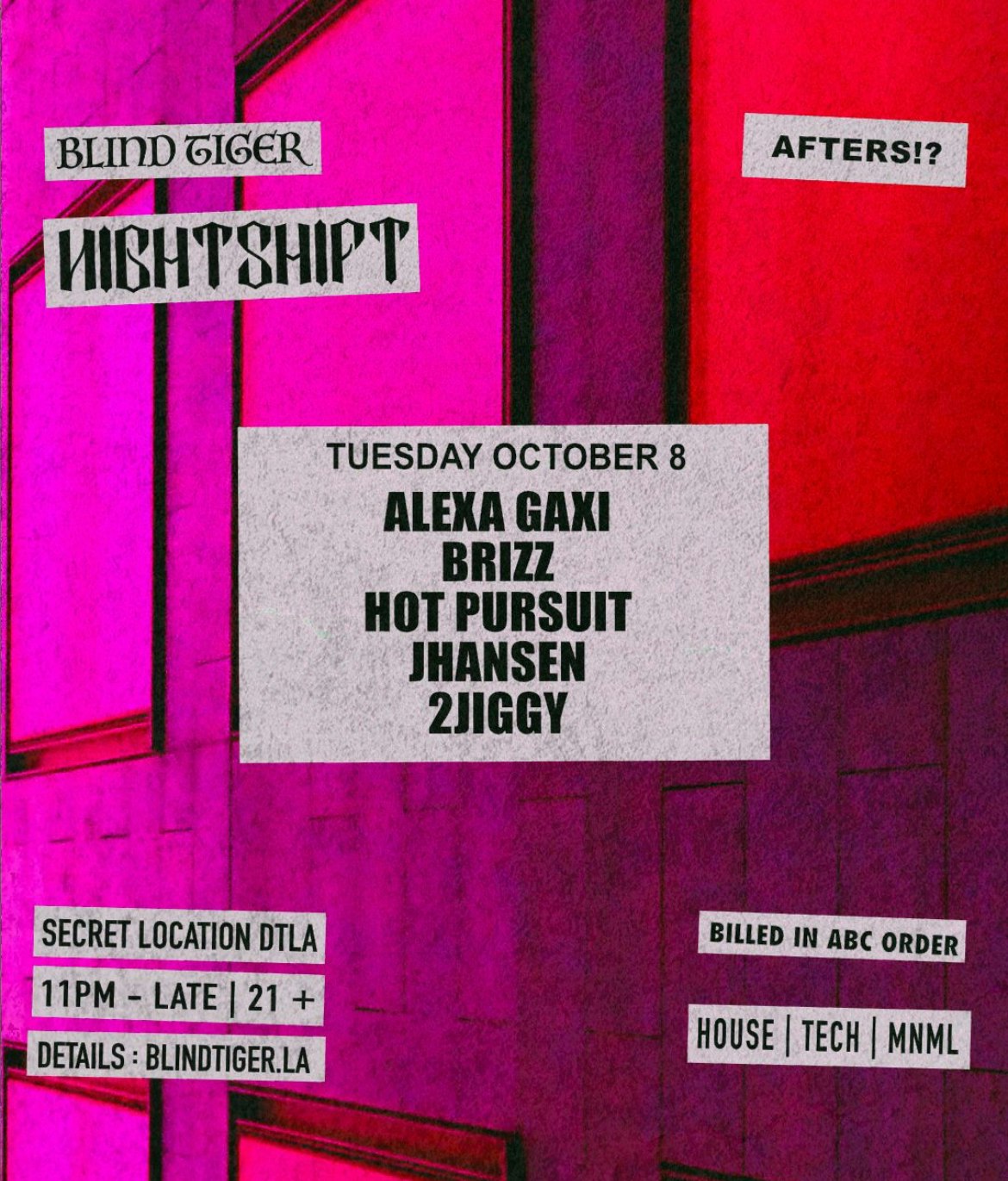 At any of our ‘Nightshift’ events you can expect to hear a strong minimal bass groove, paired with a relentless dark & sexy beat. HOUSE | TECH | MNML ADDRESS SENT WITH PURCHASE CONFIRMATION EMAIL. Presented by Blind Tiger. This is a 21+ event.