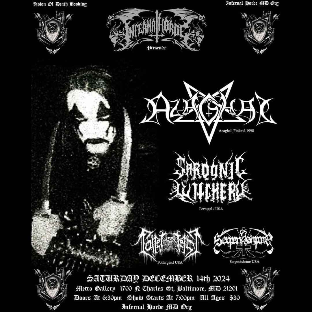 Infernal Horde Presents: AZAGHAL with Sardonic Witchery, Poltergeist and Serpentshrine Saturday Dec 14, 2024 Doors 6:30 PM, Show 7:00 PM All Ages Infernal Horde Presents All Ages