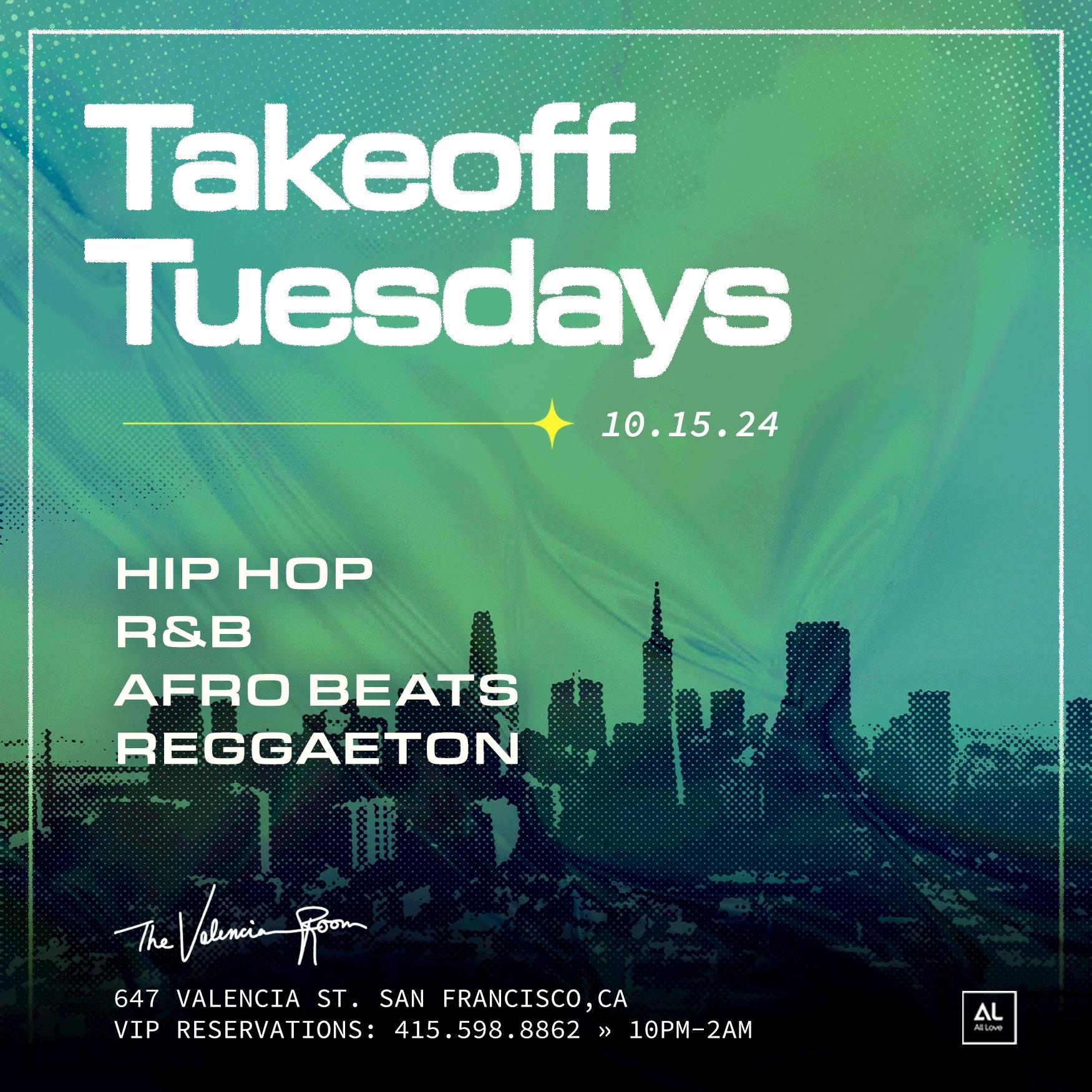 Hip Hop / R&B /Afro Beats / Reggaeton TAKEOFF TUESDAYS - Hip Hop / R&B /Afro Beats / Reggaeton 🔉Music: @HELLAIRRY - @POPIT4SLIM 🎟 Free All Nite Guestlist 🍾$200 Bottle Specials! Welcome Dreamforce! #hiphop #openformat #rnb #trap #rnbmusic #thecity #sfgate #Bayareabuzz #Mission #sfparty #sfevents #sfweekly #partysf #weeklysf #sanfranciscoparty #bayarea #sfclubs #sfclubbing #dothebay #missionsf #sfmission #bottleservice #vip #nightlife #nightclub #voidacoustics #thevalenciaroom
