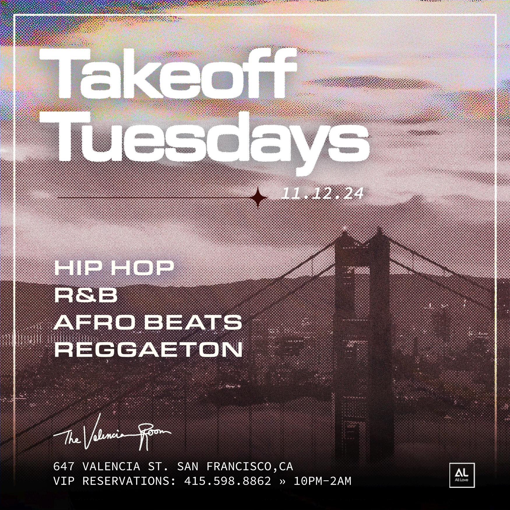 Hip Hop / R&B /Afro Beats / Reggaeton TAKEOFF TUESDAYS - Hip Hop / R&B /Afro Beats / Reggaeton 🔉Music: @HELLAIRRY - @POPIT4SLIM 🎟 Free All Nite Guestlist 🍾$200 Bottle Specials! Welcome Dreamforce! #hiphop #openformat #rnb #trap #rnbmusic #thecity #sfgate #Bayareabuzz #Mission #sfparty #sfevents #sfweekly #partysf #weeklysf #sanfranciscoparty #bayarea #sfclubs #sfclubbing #dothebay #missionsf #sfmission #bottleservice #vip #nightlife #nightclub #voidacoustics #thevalenciaroom