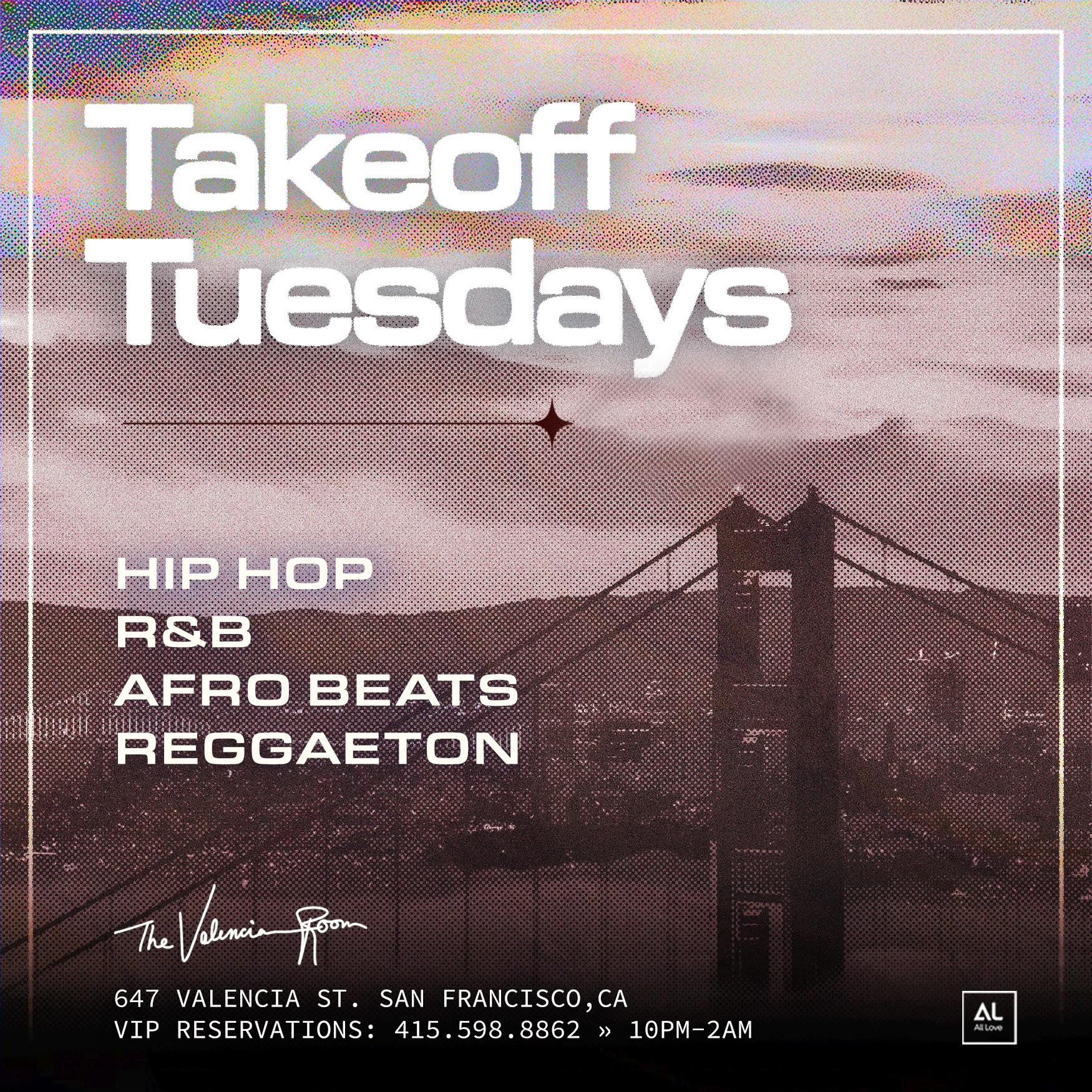 Hip Hop / R&B /Afro Beats / Reggaeton TAKEOFF TUESDAYS - Hip Hop / R&B /Afro Beats / Reggaeton 🔉Music: Valencia Room Resident DJ's 🎟 Free All Nite Guestlist 🍾$200 Bottle Specials! #hiphop #openformat #rnb #trap #rnbmusic #thecity #sfgate #Bayareabuzz #Mission #sfparty #sfevents #sfweekly #partysf #weeklysf #sanfranciscoparty #bayarea #sfclubs #sfclubbing #dothebay #missionsf #sfmission #bottleservice #vip #nightlife #nightclub #voidacoustics #thevalenciaroom