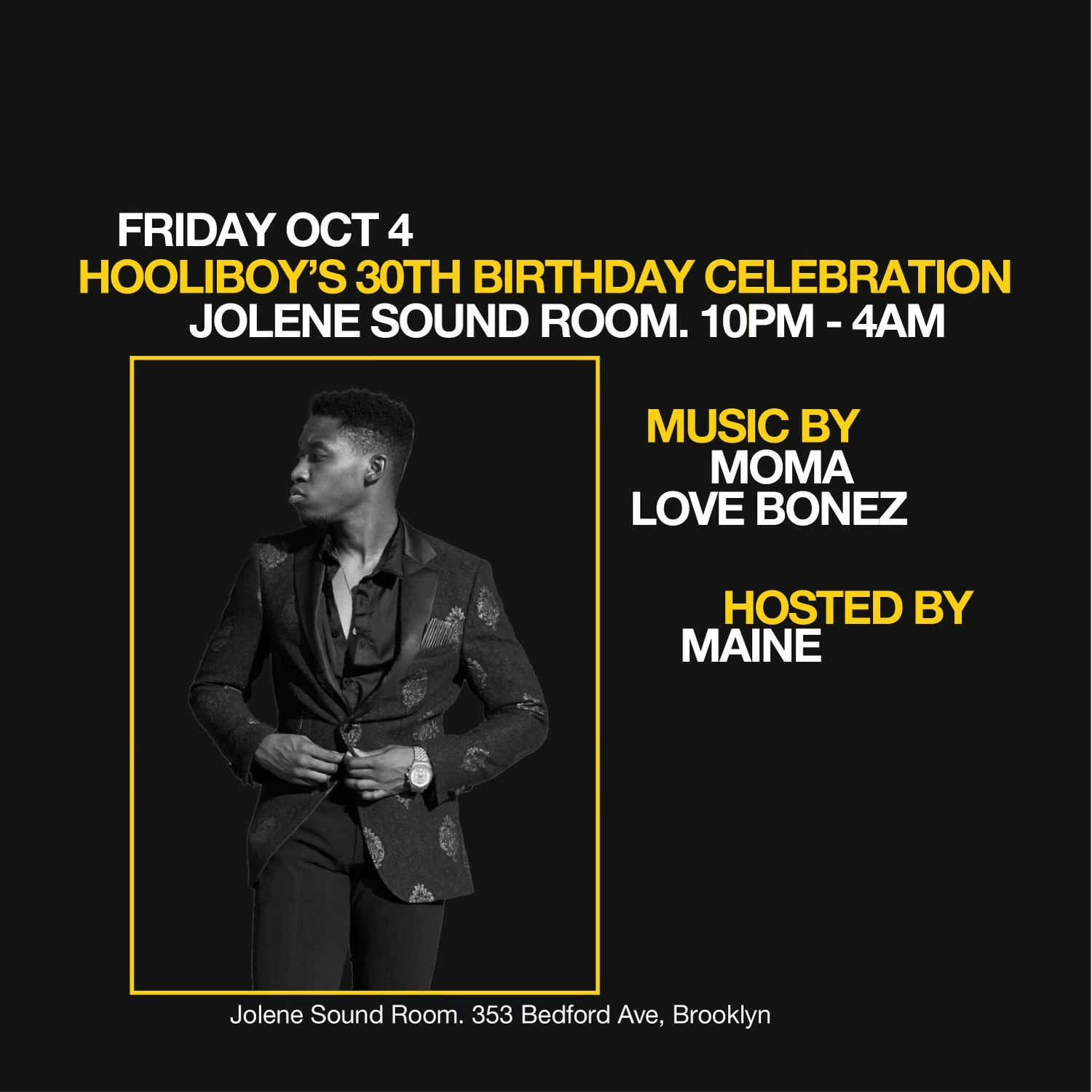 Join in as we bring in the 30th birthday for the global star Hooliboy. This is for all to celebrate his continued success and joy of movement & music. We'll be at Jolene's Sound Room 353 Bedford Ave, Brooklyn, NY 11211 Music by DJ Moma & Lovebonez Hosted by Maine šš¾šŖ© 10pm - 4am š«¶š¾ Presented by Hillside Chillside. This is a 21+ event