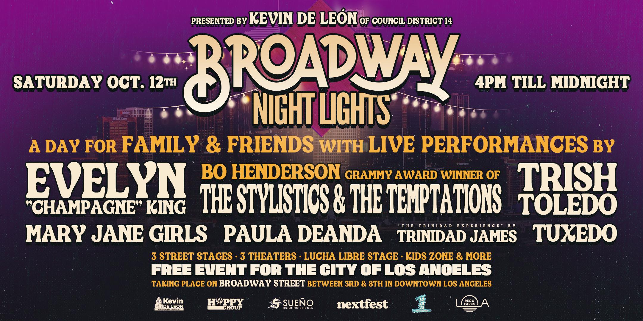 Broadway Night Lights Saturday October 12th 2024 with Live Performances: Evelyn Champagne King, Mary Jane Girls, Trish Toledo & many more!