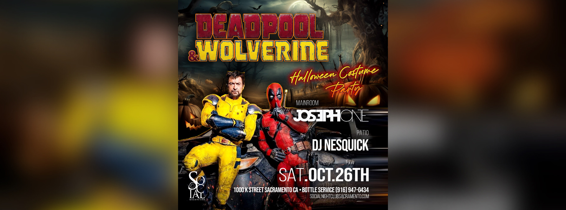 Saturday, October 26th Social Nightclub Presents "Deadpool & Wolverine" - Halloween Costume Party ft. Dj Joseph ONE in the main room (Club hits, Hip Hop/Top40, R&B) & Dj Nesquick on the rooftop patio (Latin/Reggaeton/Throwbacks).