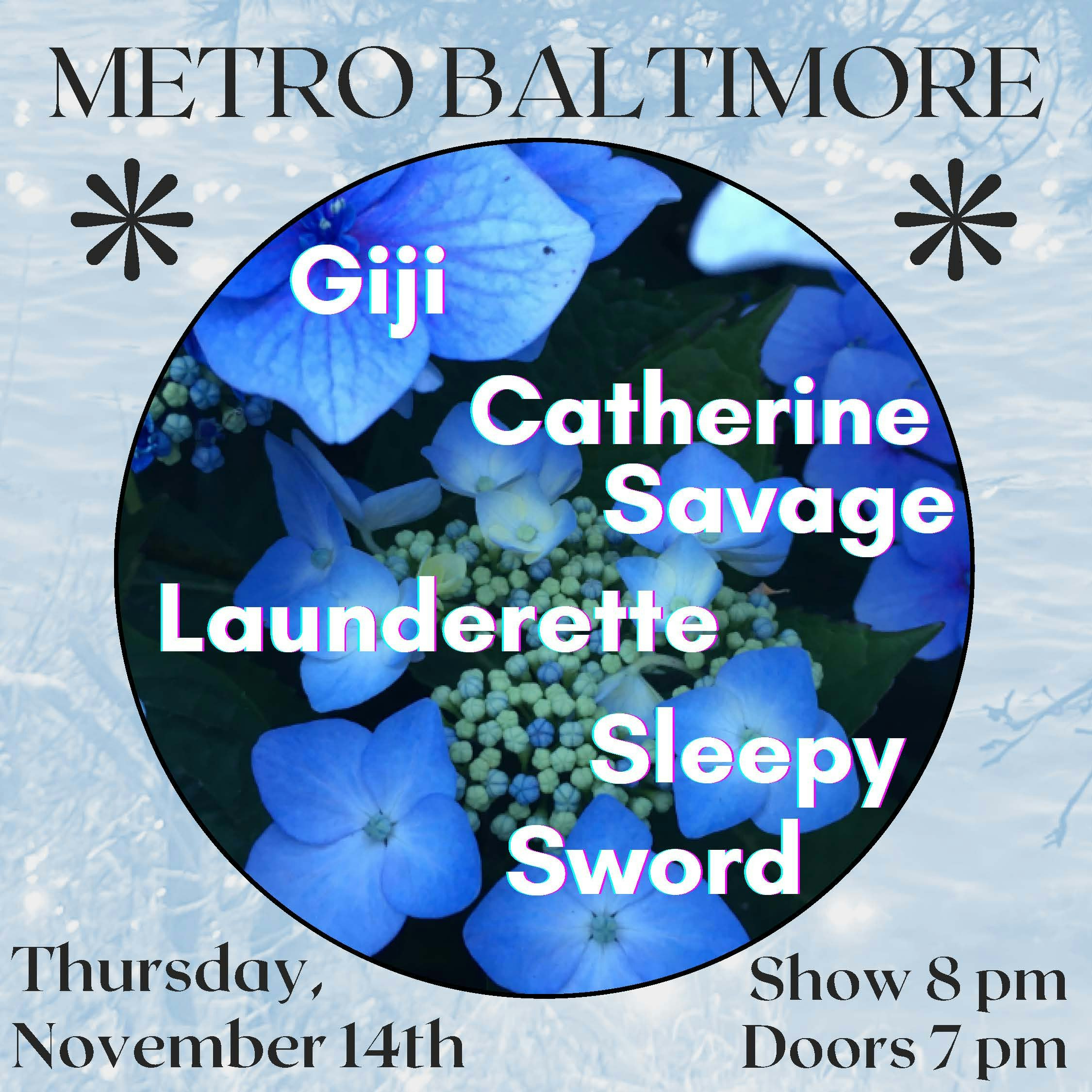 CATHERINE SAVAGE with Giji, Sleepy Sword and Launderette Thursday November 14, 2024 Doors at 7:00 PM, Show at 8:00 PM All Ages Presented by Metro Gallery LLC. All ages