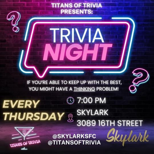 21+ Happy Hour Trivia Thursdays at Skylark Every Thursday it's Trivia Night! Happy Hour 7pm-10pm Trivia 7pm-8:30pm (followed by free comedy show) Get the team together it's time for Trivia!